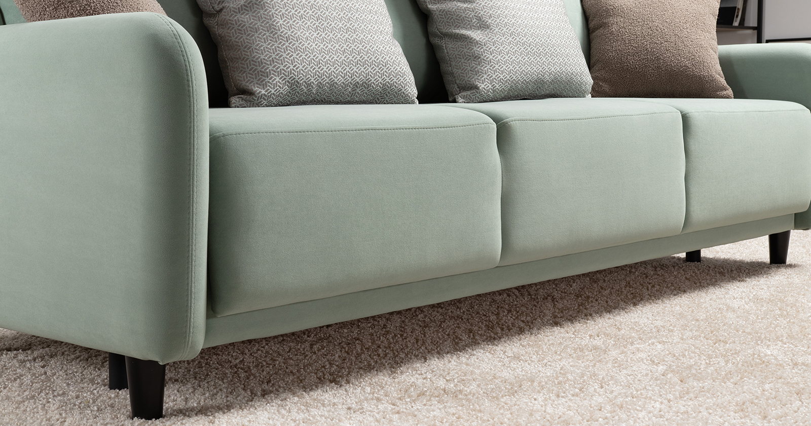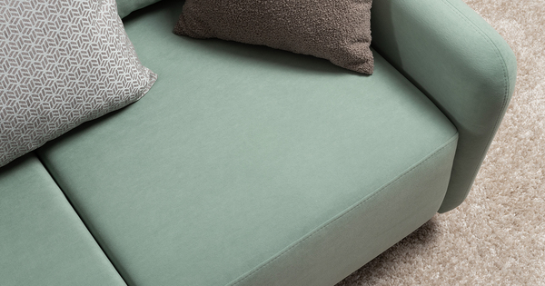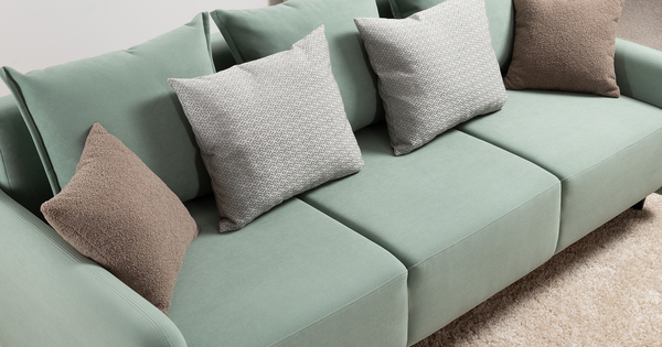 В комплекте 5 двусторонних приспинных подушки и 2 декоративные думки. Задняя спинка в ткани основы. Декоративные отделочные строчки по боковинам и сиденью