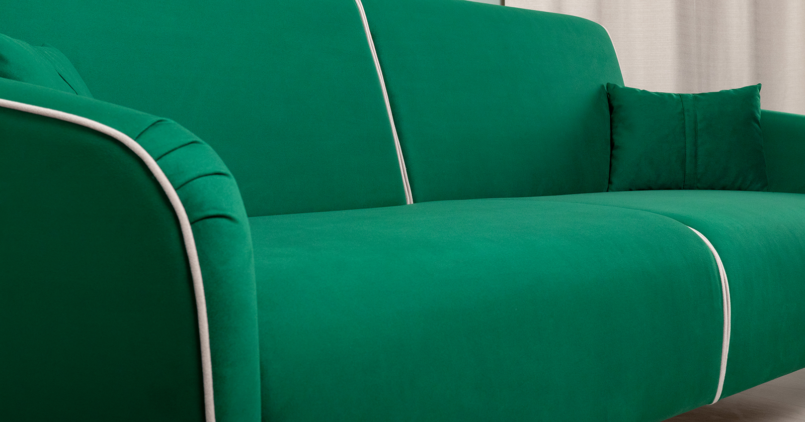 Спинка и сиденье разделяются пополам двойным кантом по центру и одинарным по краям сидения, для придания одной единой формы. Подлокотники с изгибом на лицевой стороне и мягкими закругленным углом со складками, с выраженным контрастным ровным кантом по внешнему контуру изделия и изогнутой линией канта.