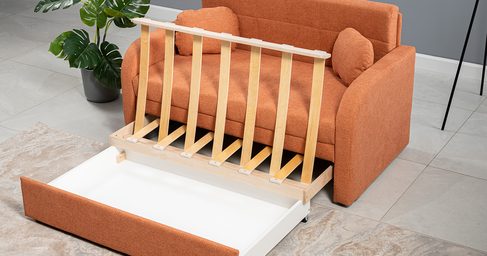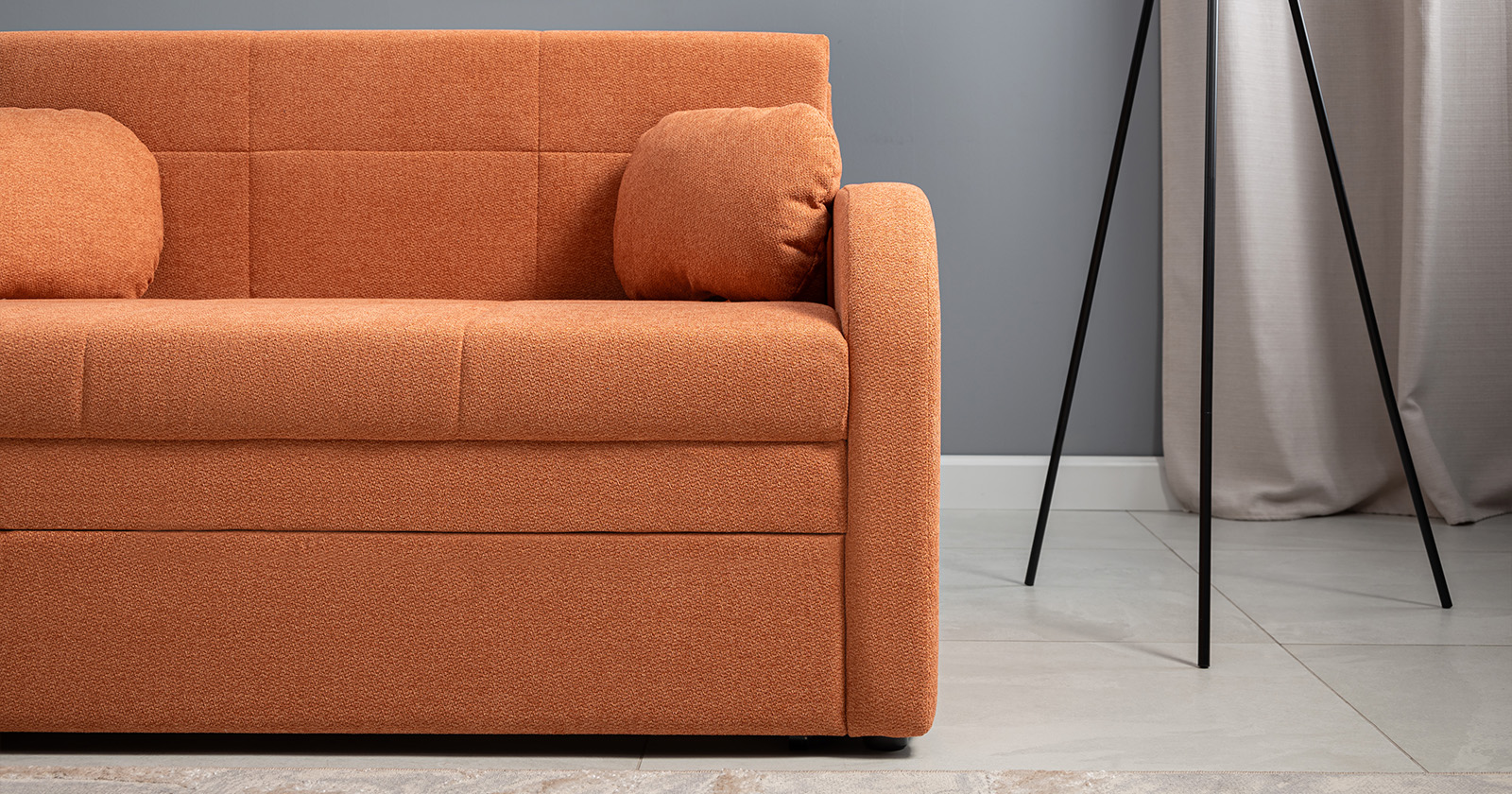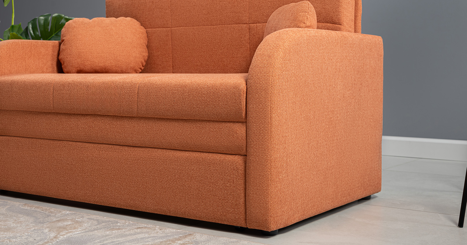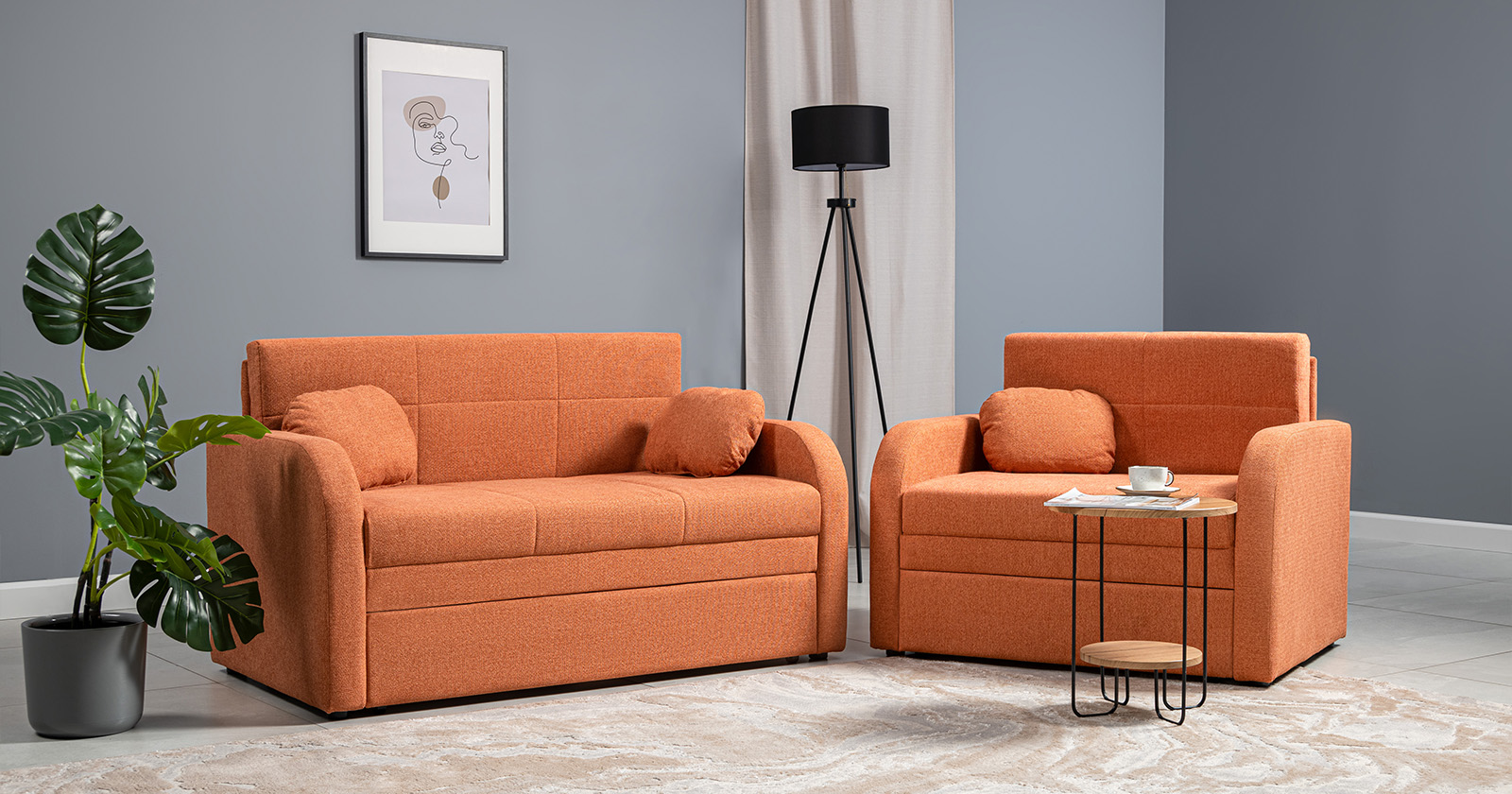 Коллекция выполнена в современном минималистичном стиле с мягкой обивкой из износостойкой ткани и декоративной стежкой, подчеркивающей геометрию форм. Механизм трансформации обеспечивает дополнительное спальное место, делая мебель не только эстетичной, но и максимально функциональной для небольших пространств.