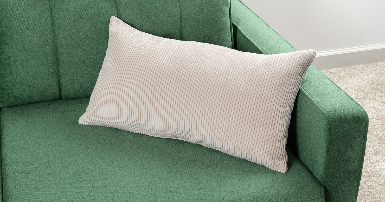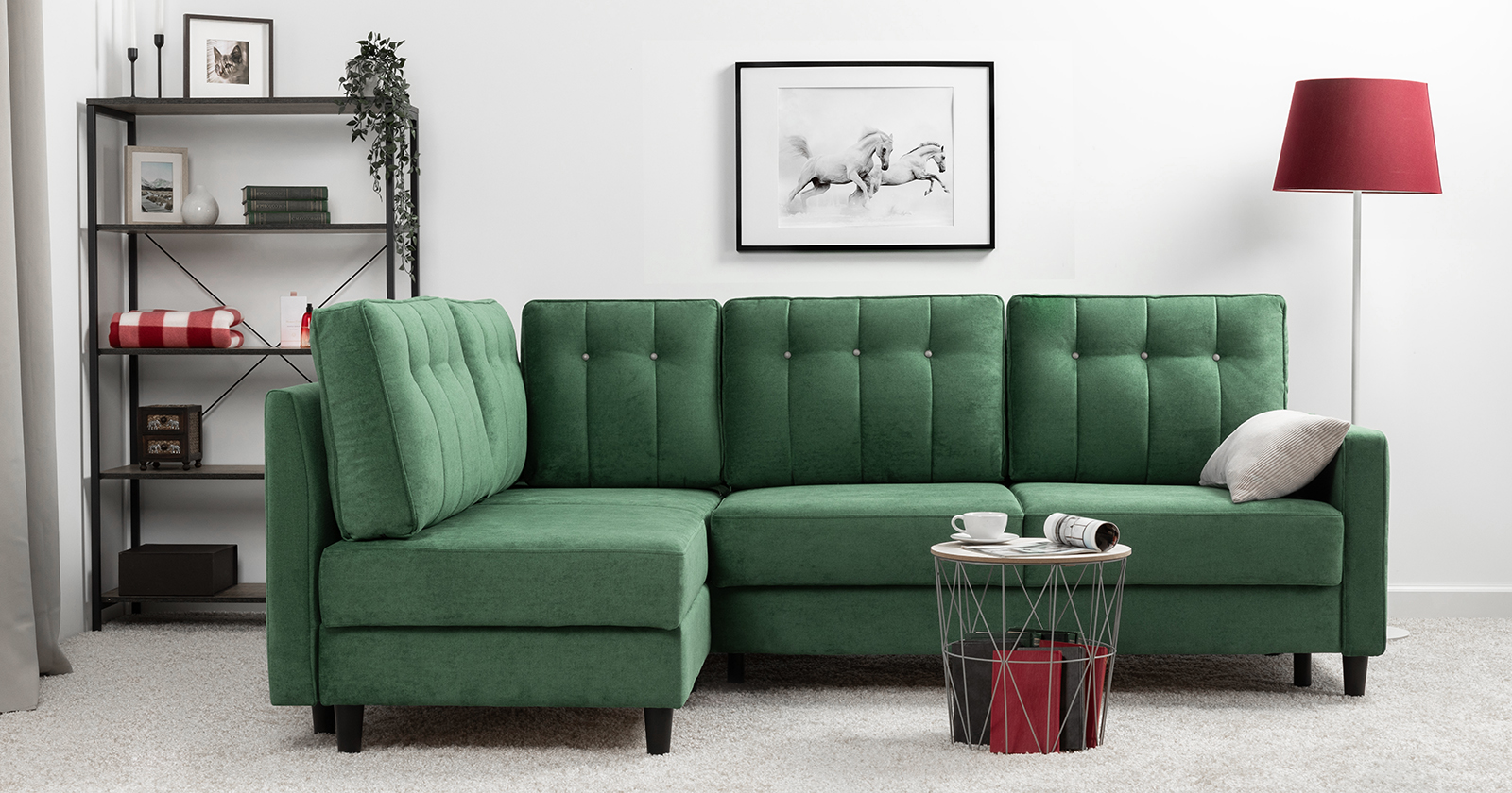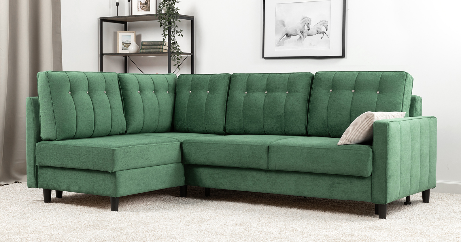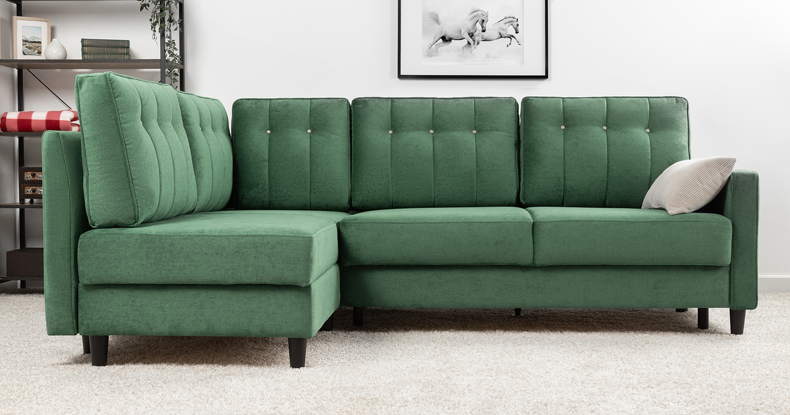 Диван-кровать угловой Арно ТД 566 велюр Лаки 20 хвойный зеленый, Vertical 910 молочно-серый, сборка на любую сторону
