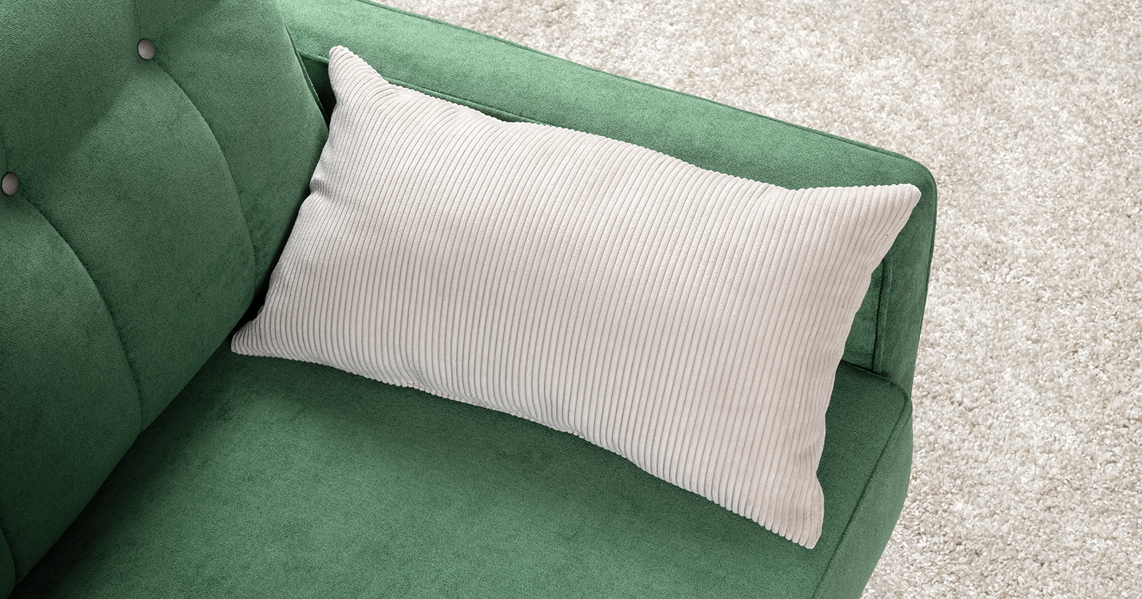 Подушки имеют трапециевидную форму, с утолщением к низу для комфорта посадки. Кант по всему периметру подушек, декоративные утяжки металлическими пуговицами, вертикальная стежка.
