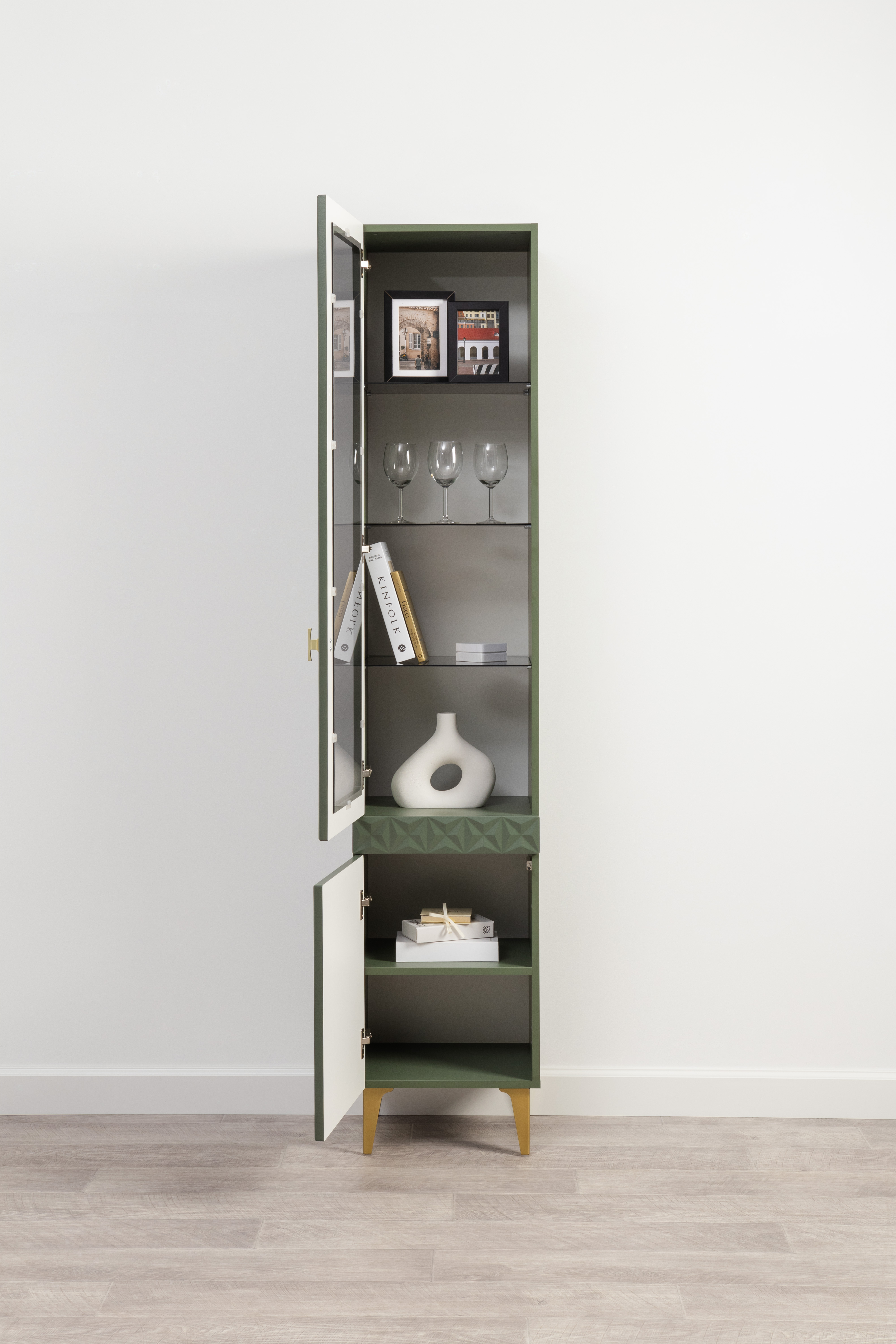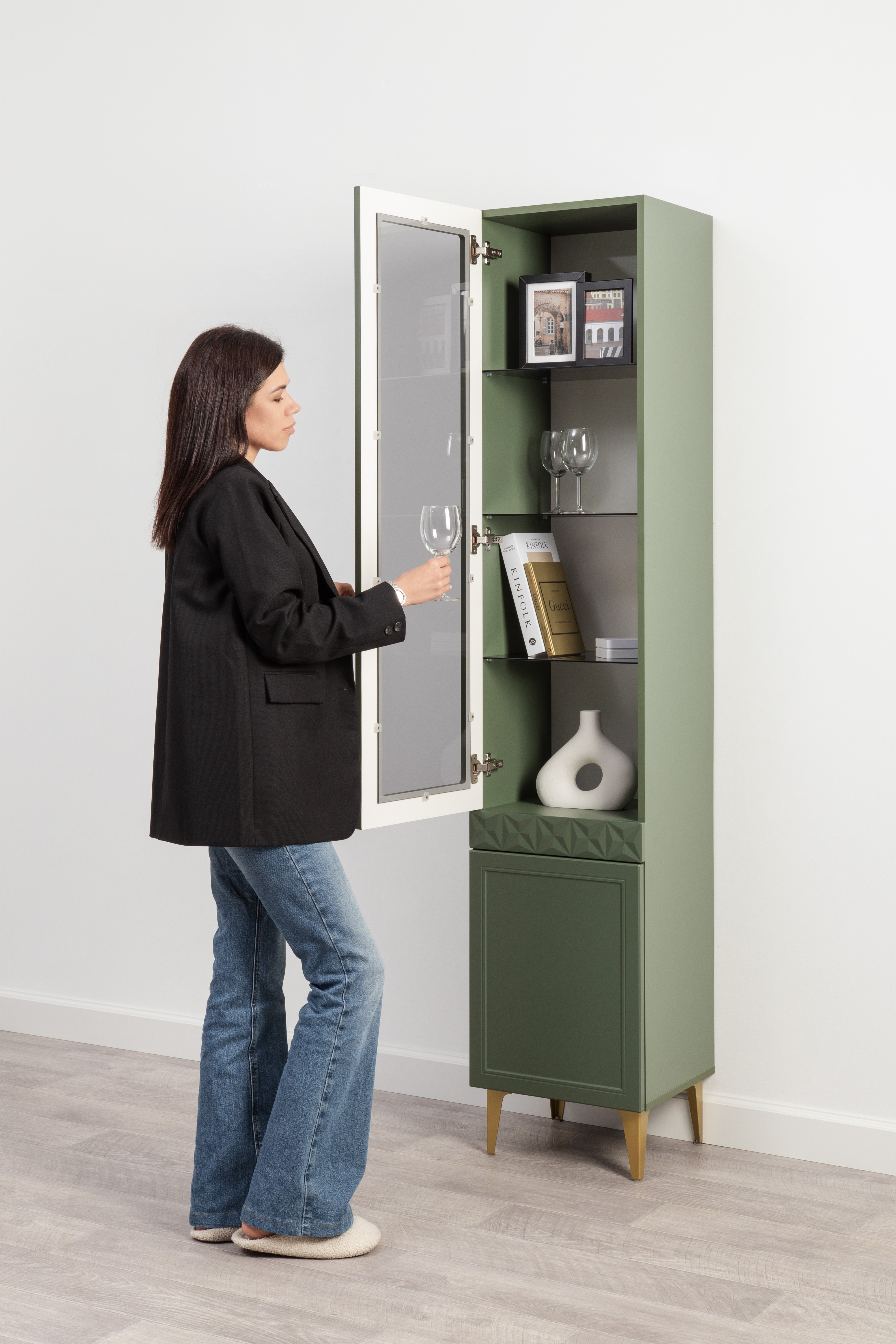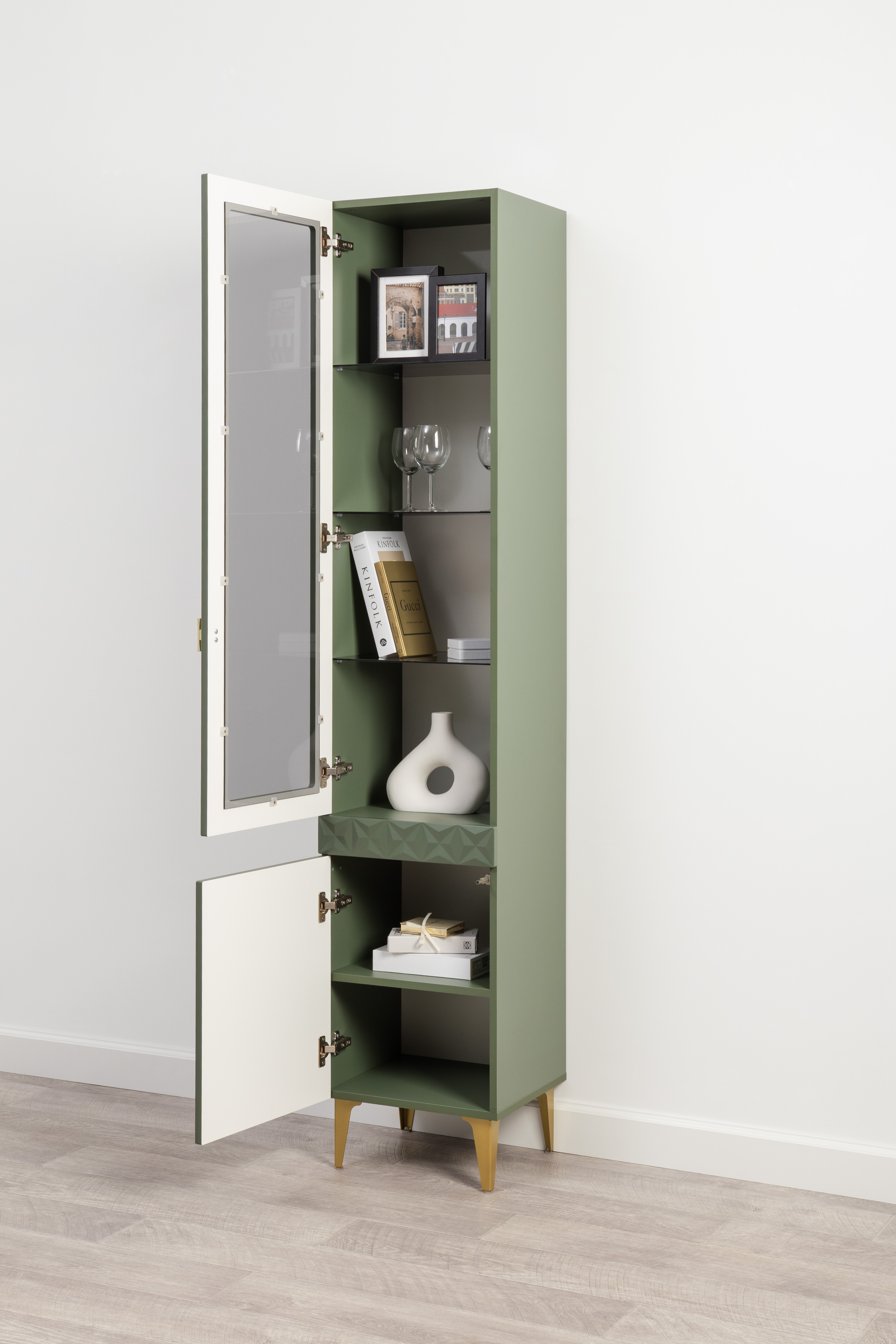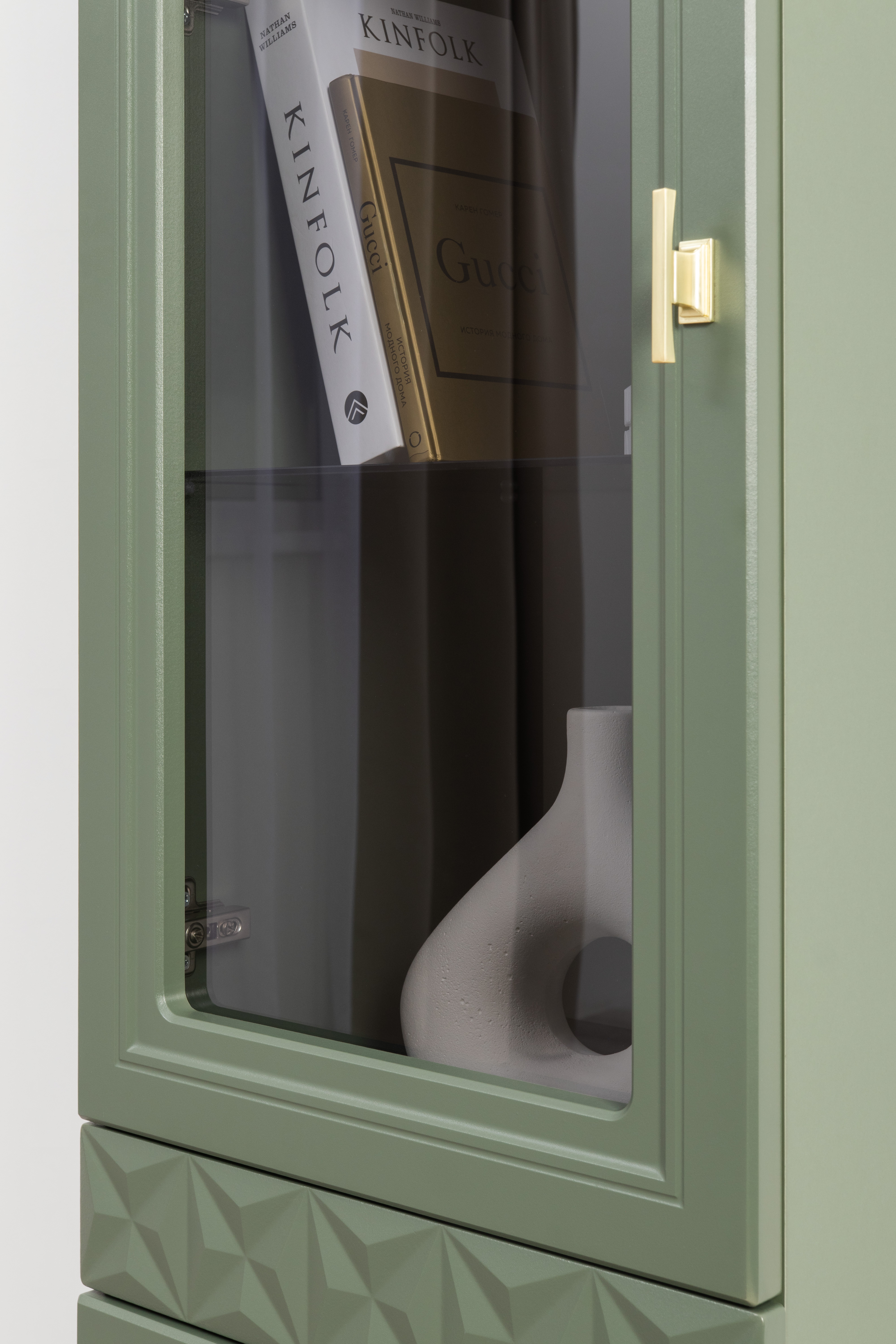 Изящные линии, глубокая фрезеровка фасадов из МДФ и благородные оттенки. Утончённая «Слоновая кость» и изысканная «Олива Шагрень» с глубоким зелёным тоном — создают атмосферу уюта, тепла и благородства. Металлические ручки и опоры золотого цвета придают мебели утончённый блеск, а петли и направляющие с доводчиками обеспечивают плавное и бесшумное закрытие фасадов.