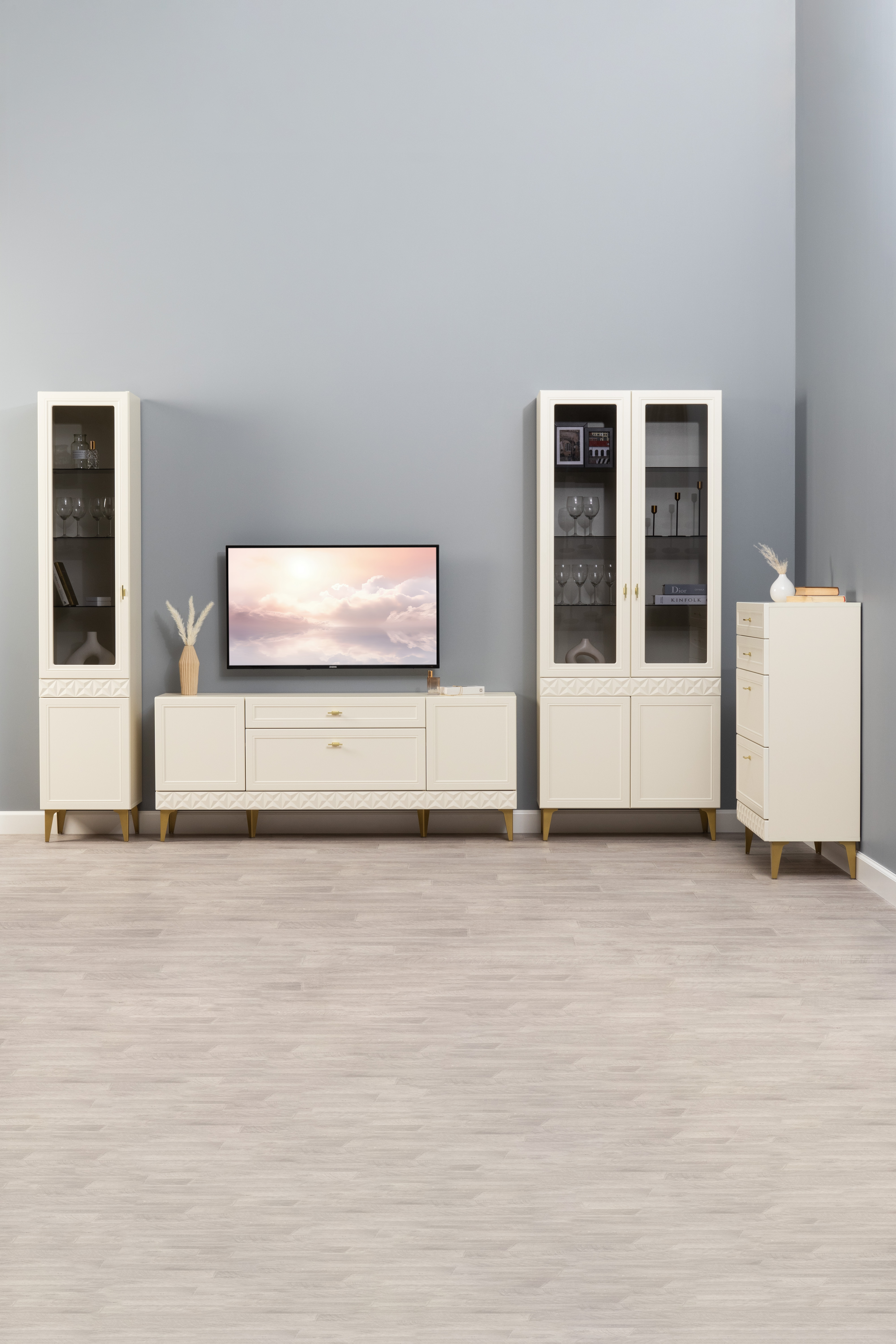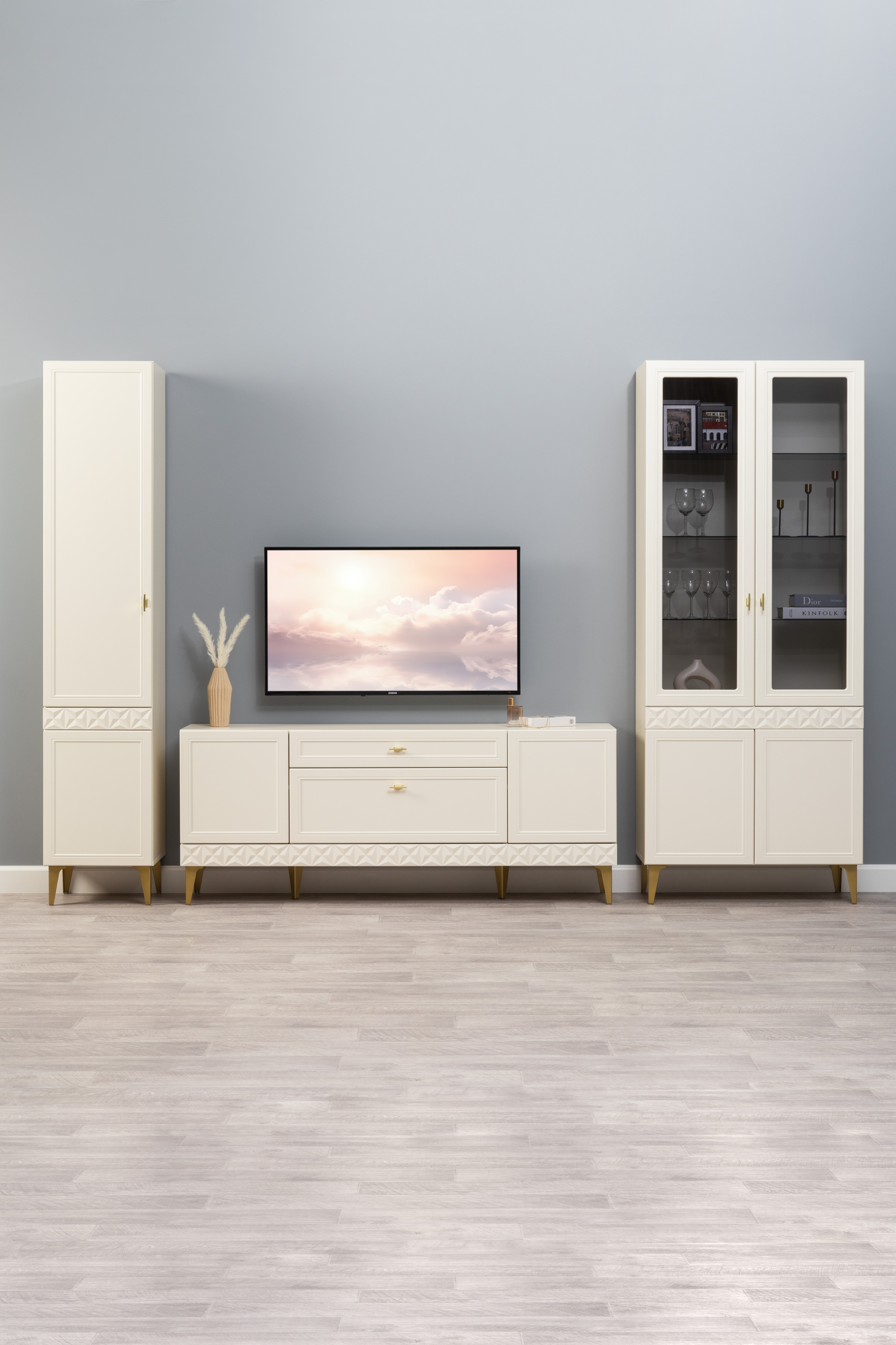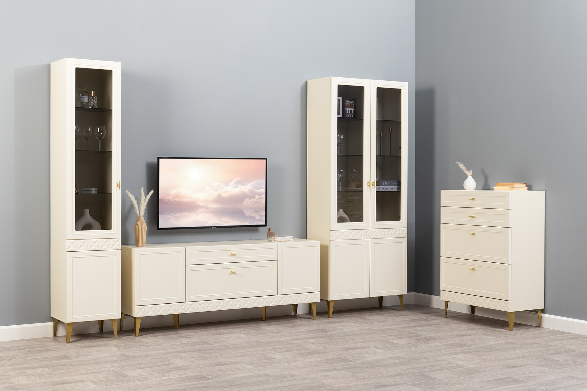 Гостиная Марион композиция 2 слоновая кость С341 PE, слоновая кость 6898 ПВХ, белый PE шагрень (собирается на любую сторону)
