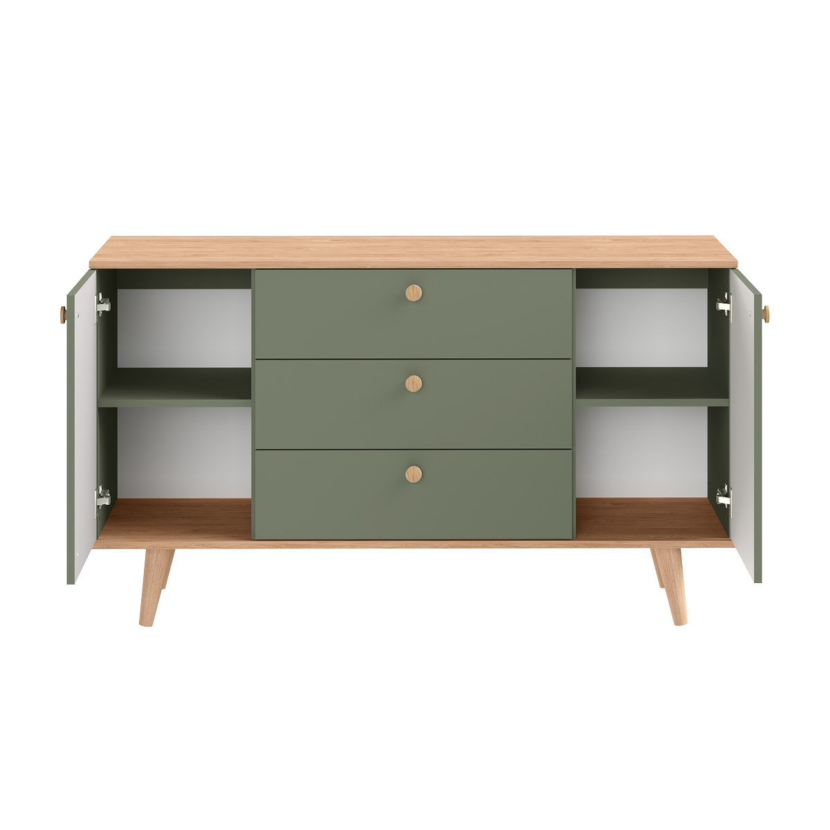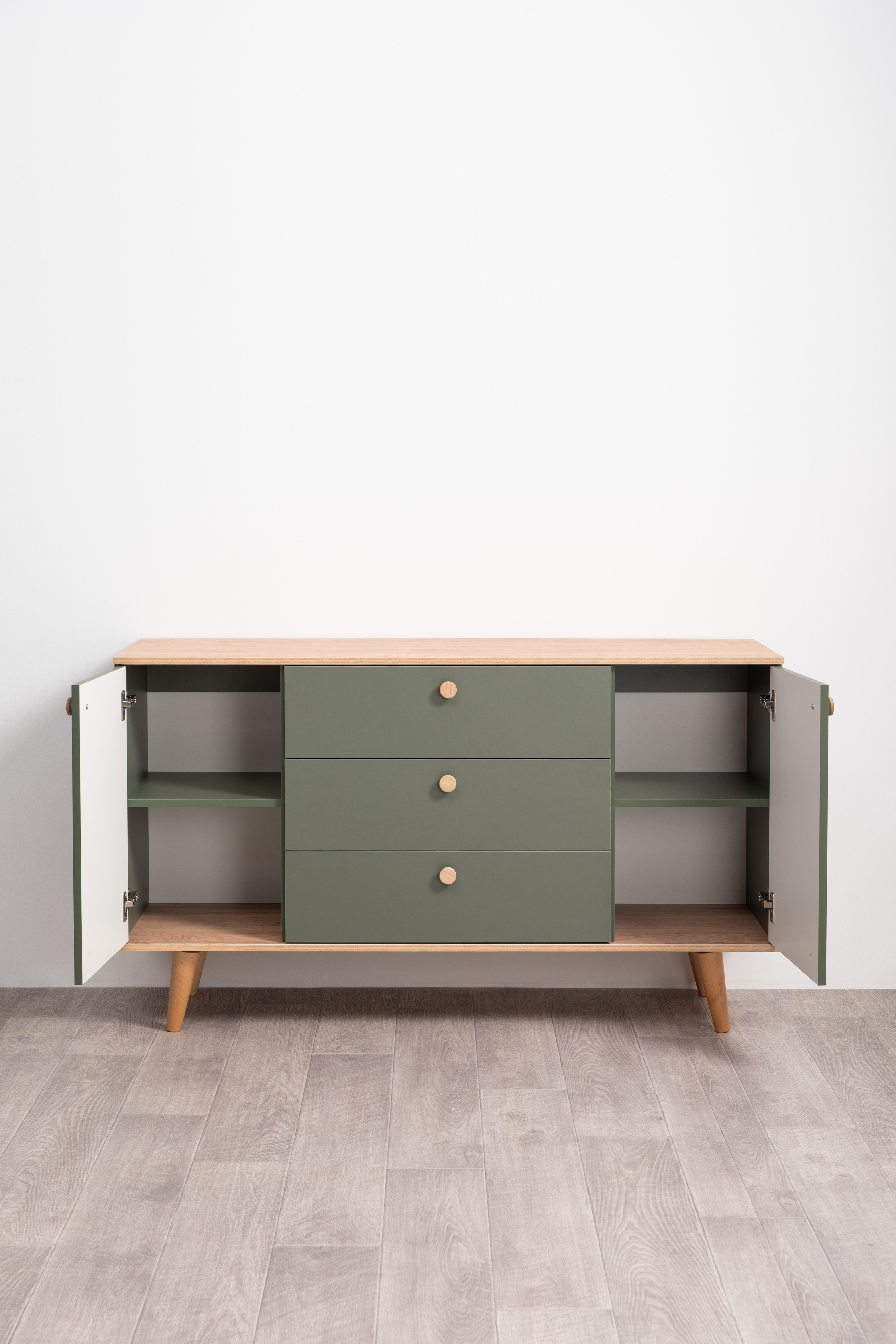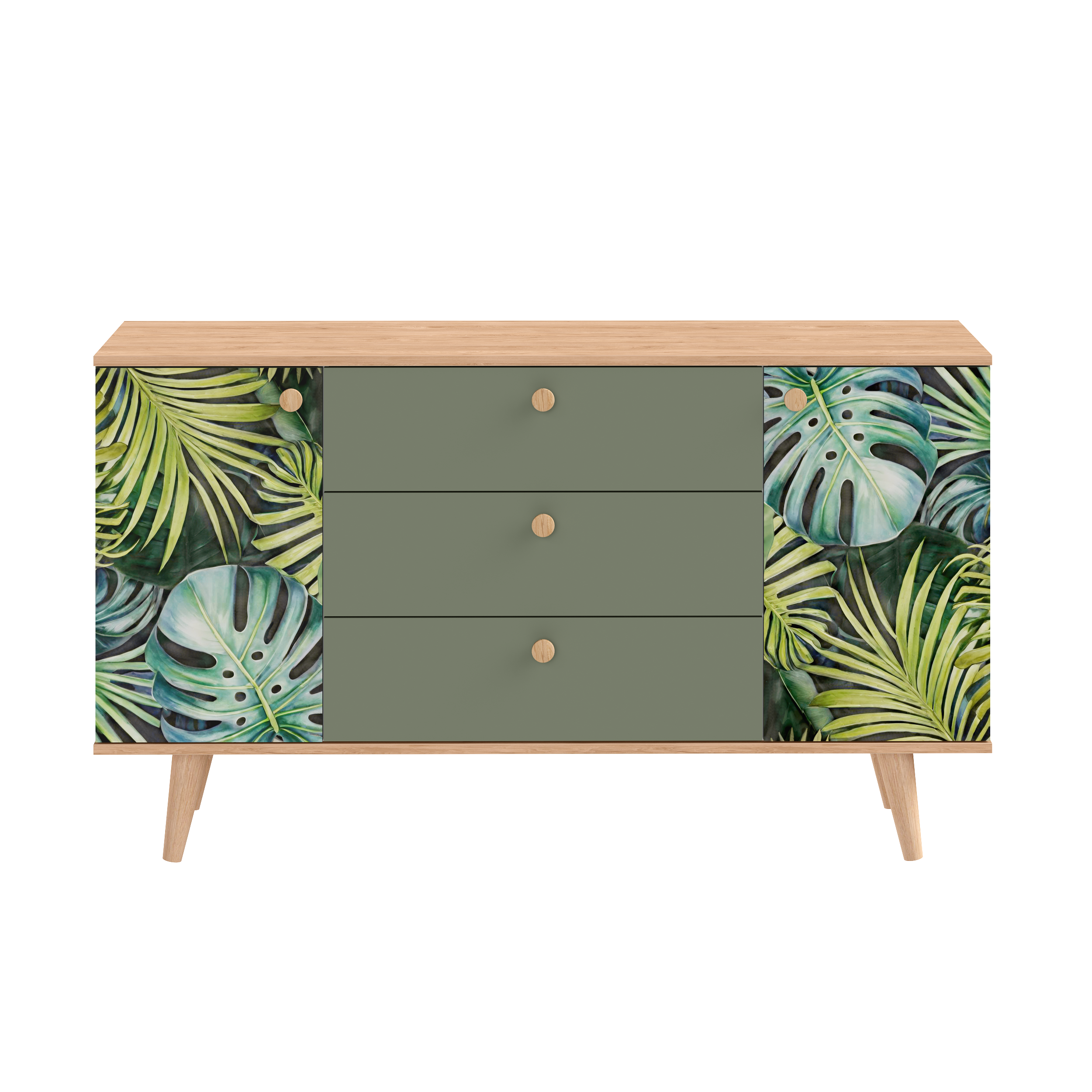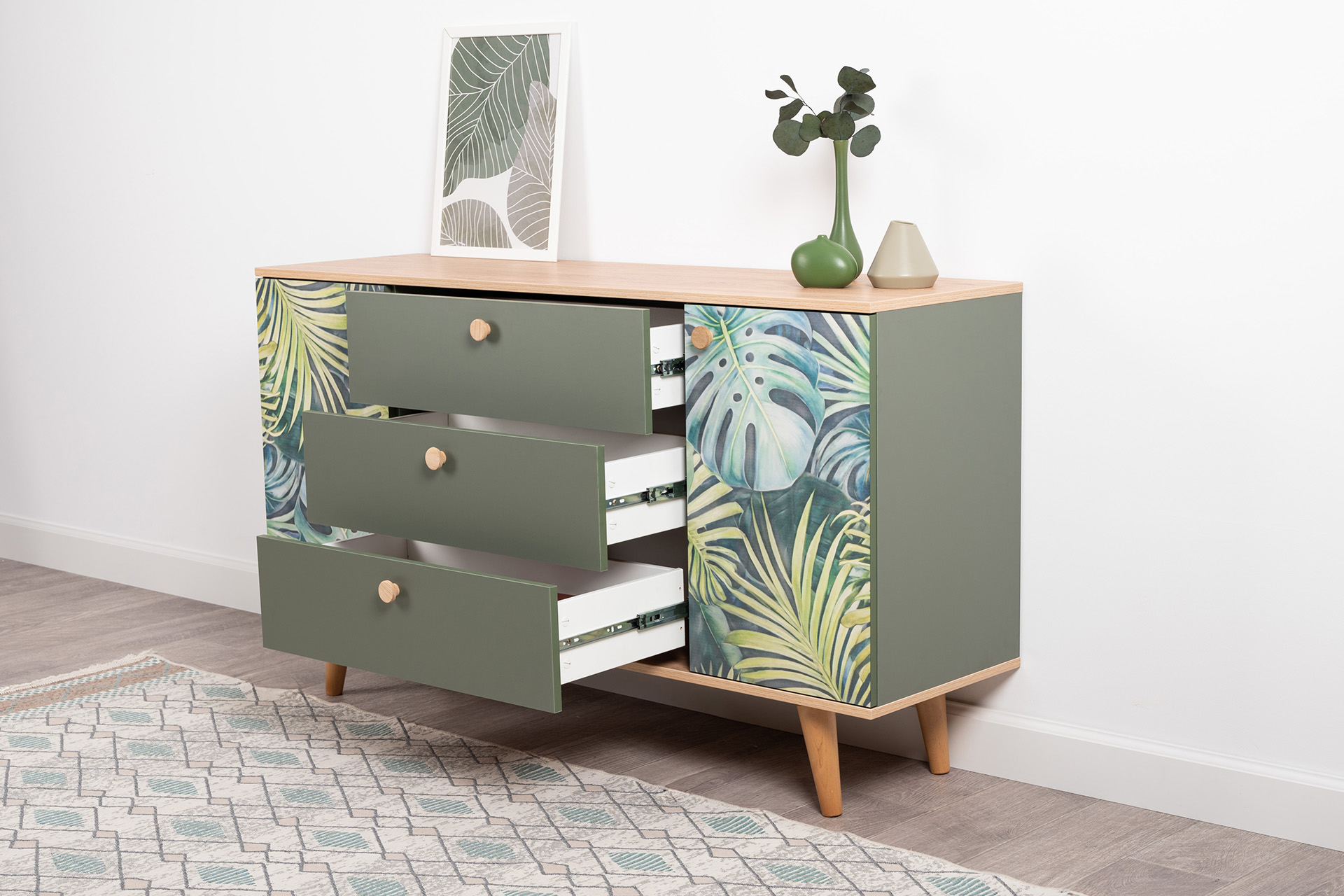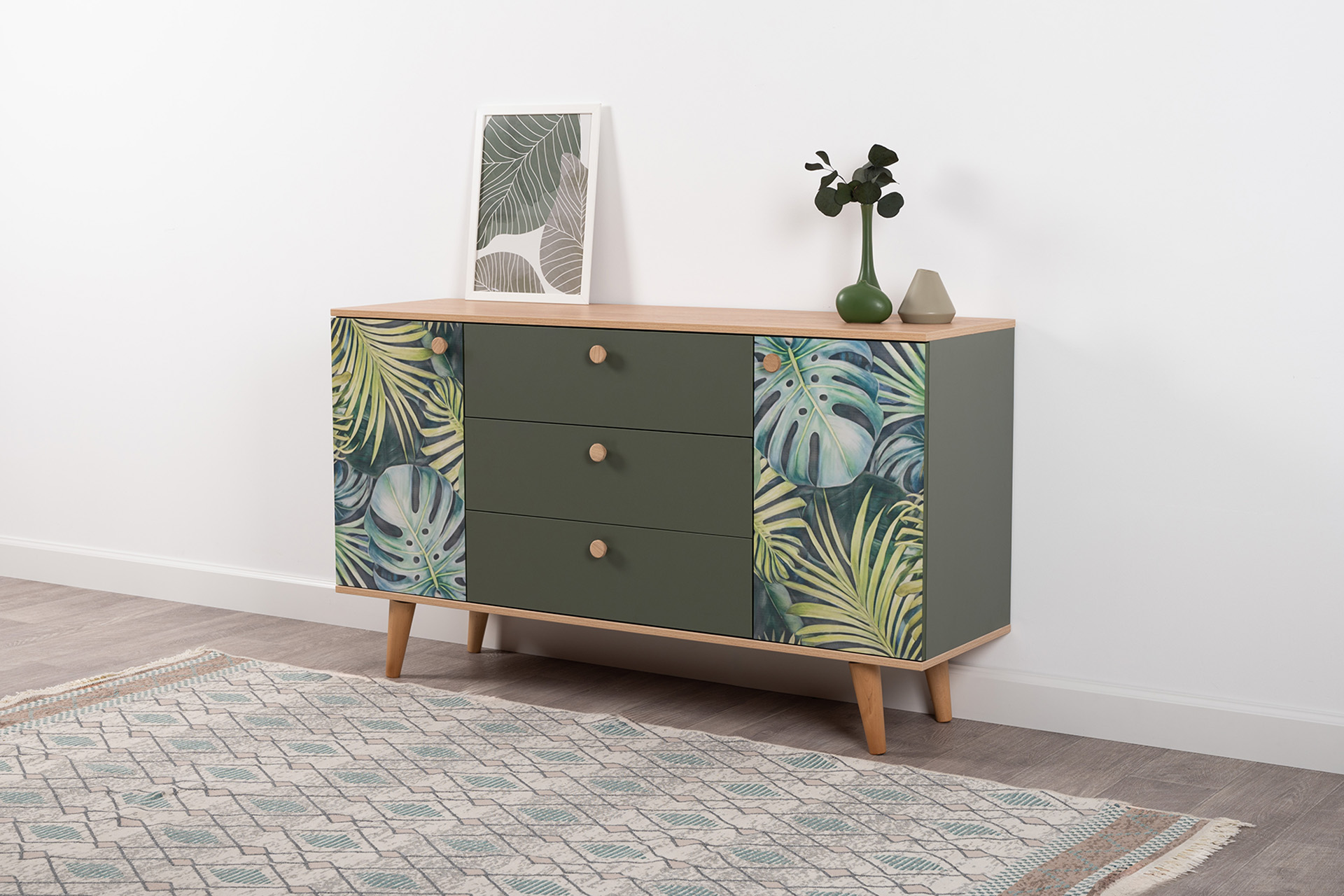 Комод Маттиас 16.245 дымчатый зеленый K521, гикори рокфорд натуральный KO86 PW, белый PE шагрень, фотопечать