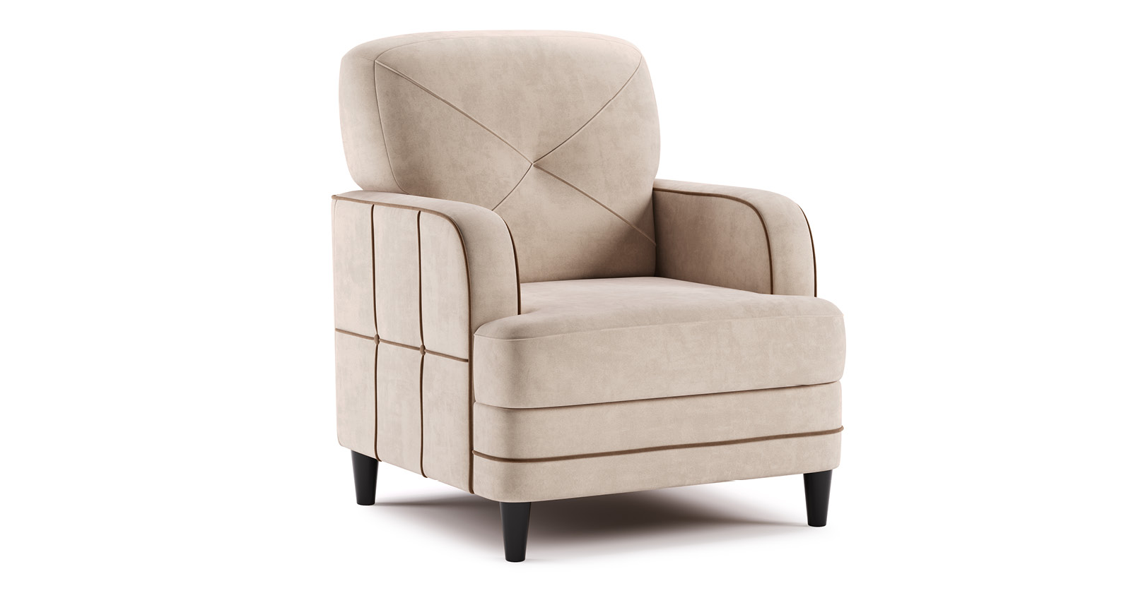 Декоративные канты на вставке подлокотников. Пуговицы в местах пересечения кантов на подушке и вставке подлокотников. По торцам подлокотников и думках контрастный декоративный кант. Защипы на сиденье и подушке.