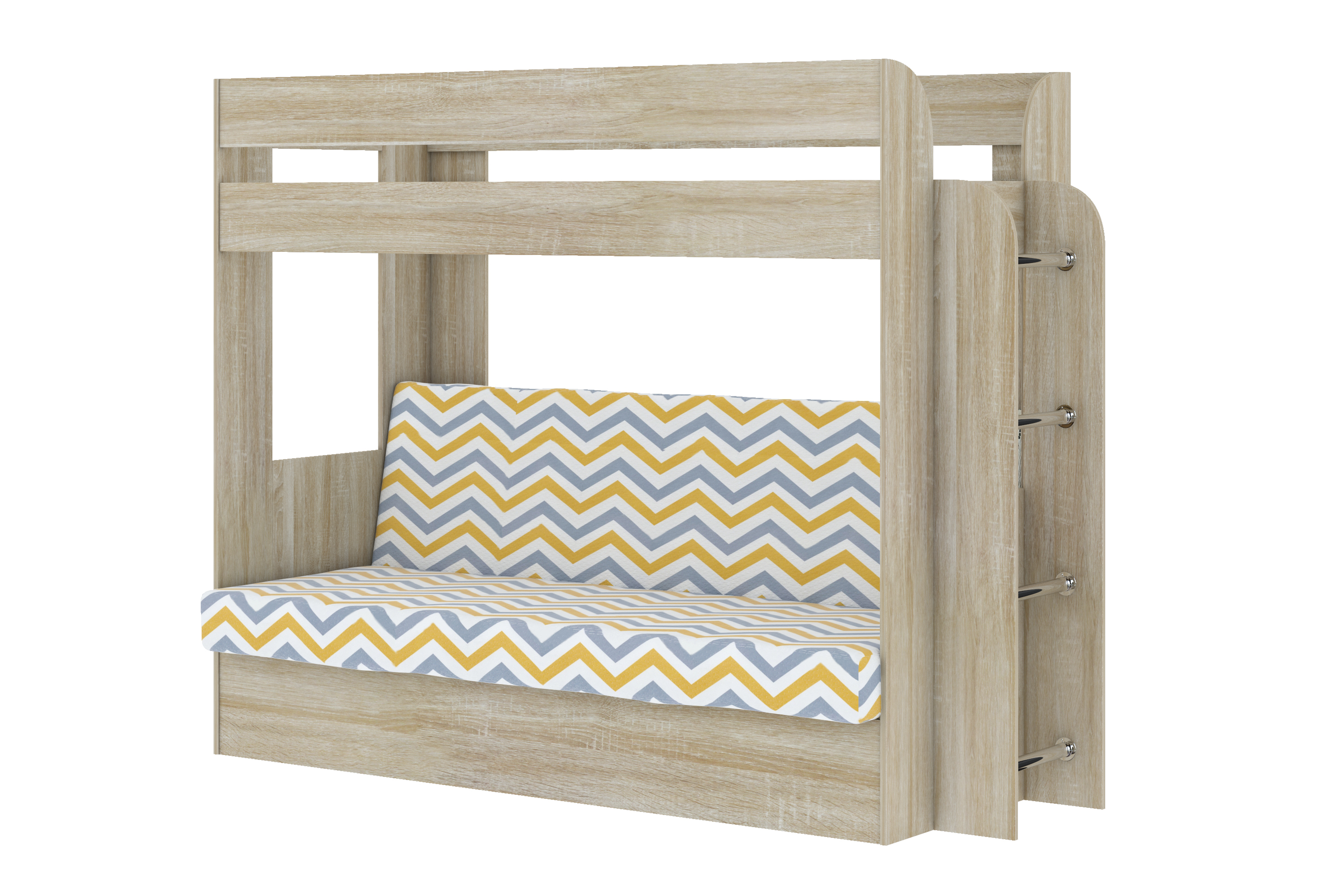 Кровать детская двухъярусная Карамель 75 Дуб Сонома, диван - велюр RIKKO YELLOW желтые зигзаги (сборка на любую сторону) спальное место верх 80х190, низ 120х185