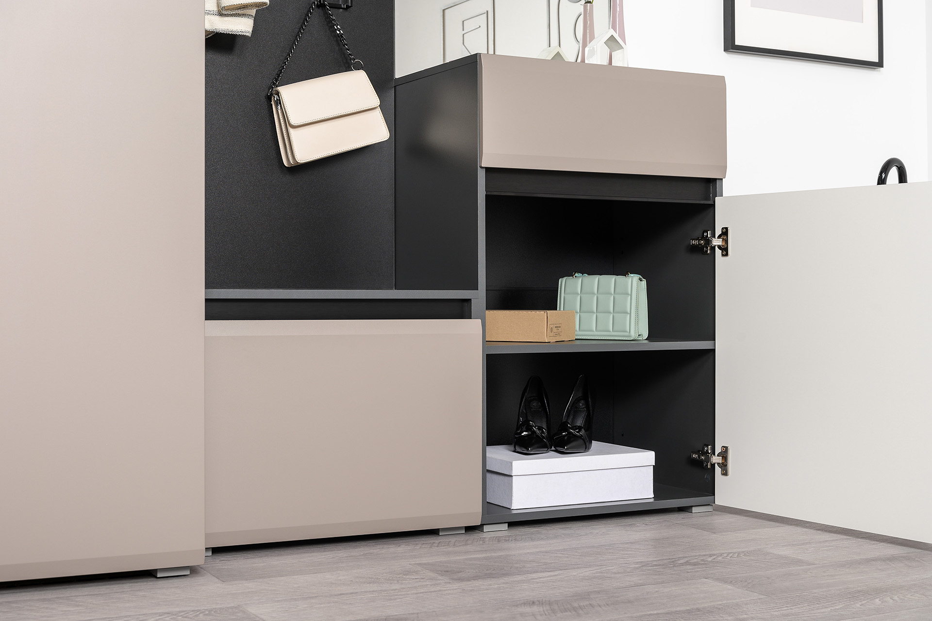 Тумба для обуви Сидней 16.129 антрацит, веллюто капучино ПВХ (универсальная сборка)