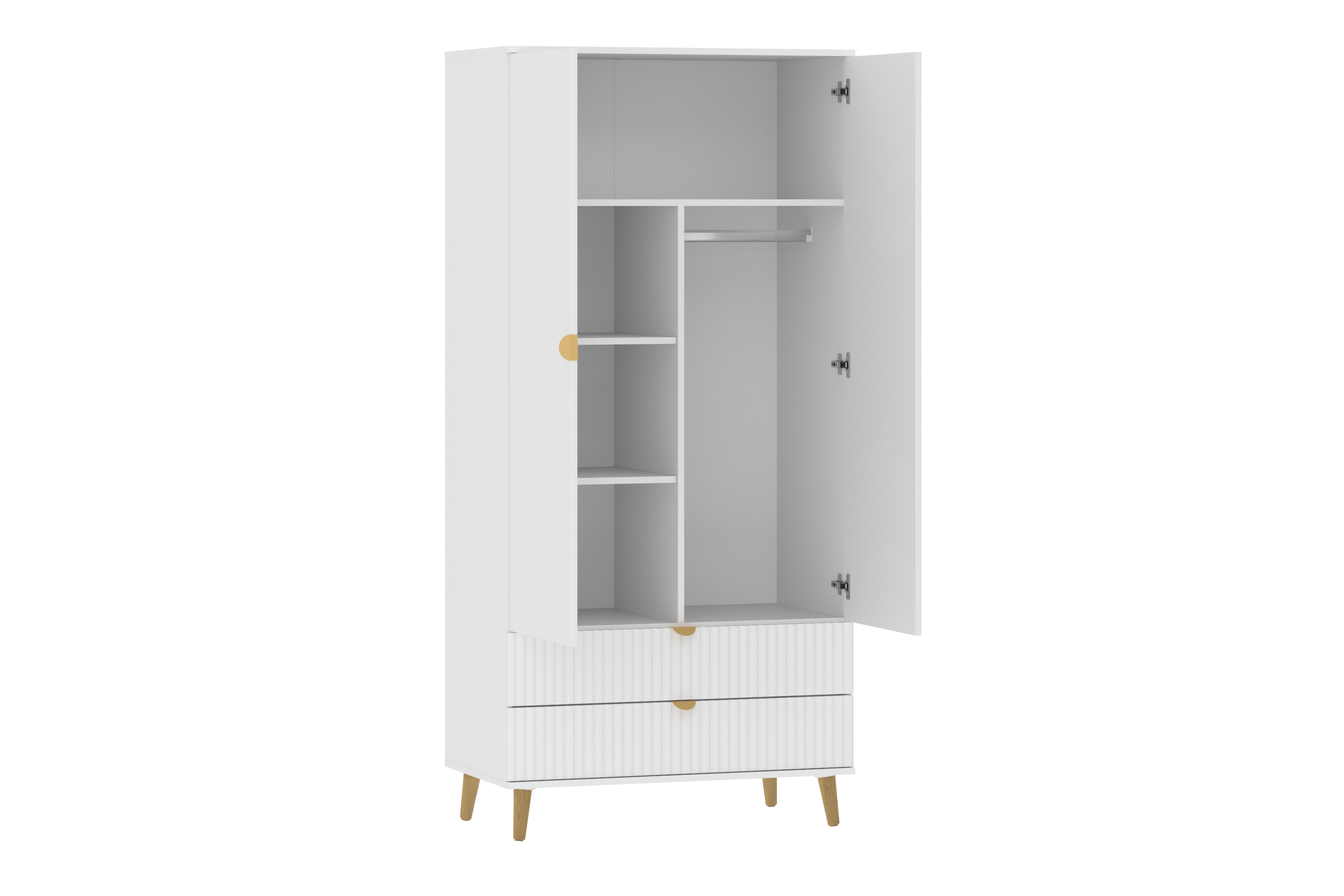 Шкаф оснащен двумя выдвижными ящиками, которые открываются плавно и бесшумно благодаря шариковым направляющим, полками, а также овальной штангой для организации предметов гардероба, а высокие опоры облегчают процесс уборки.