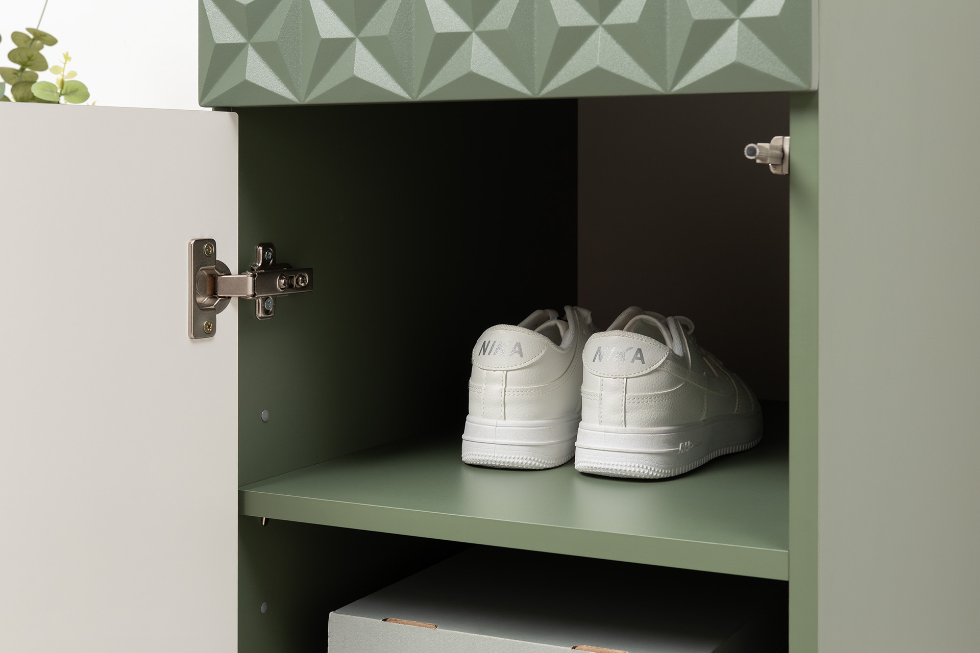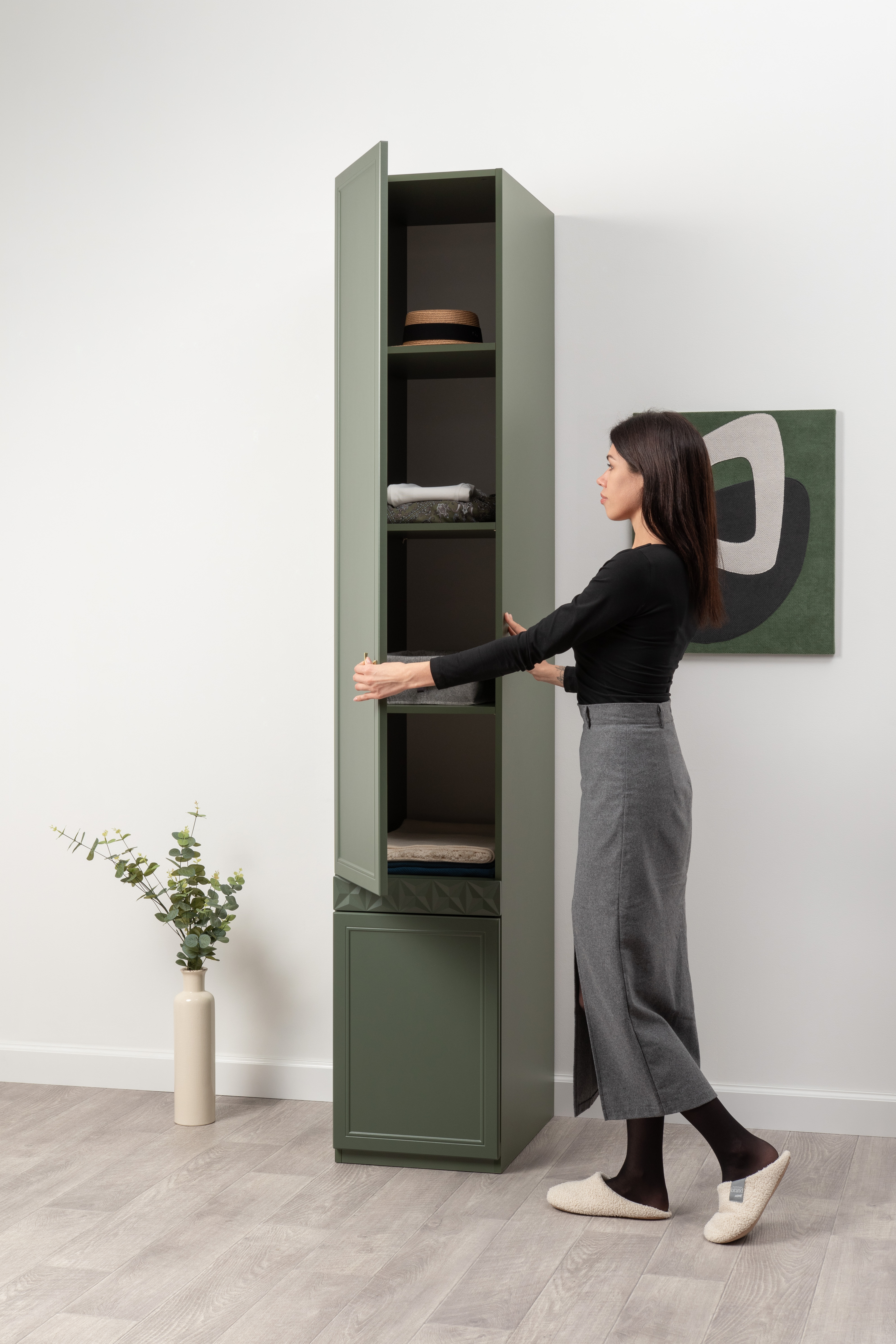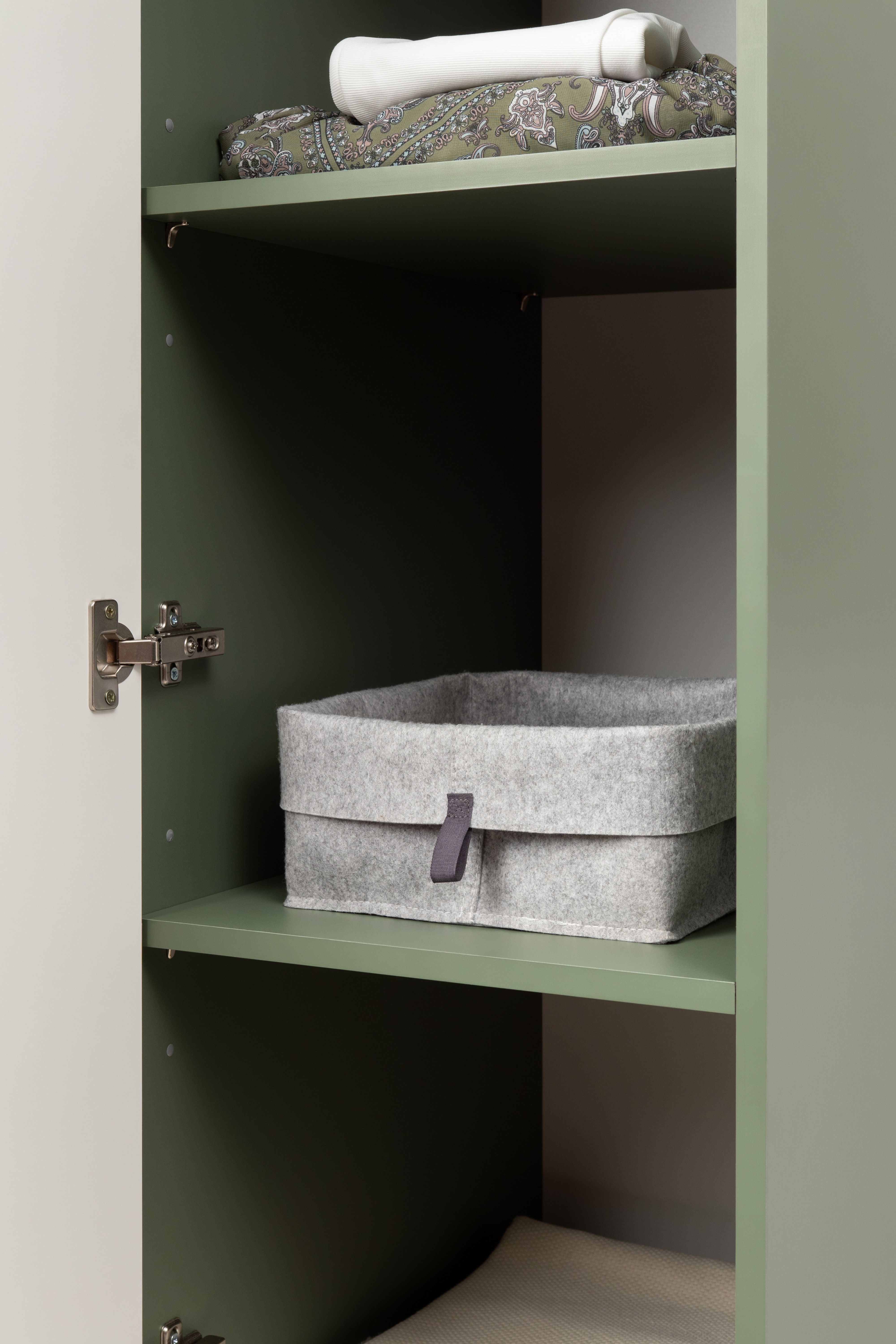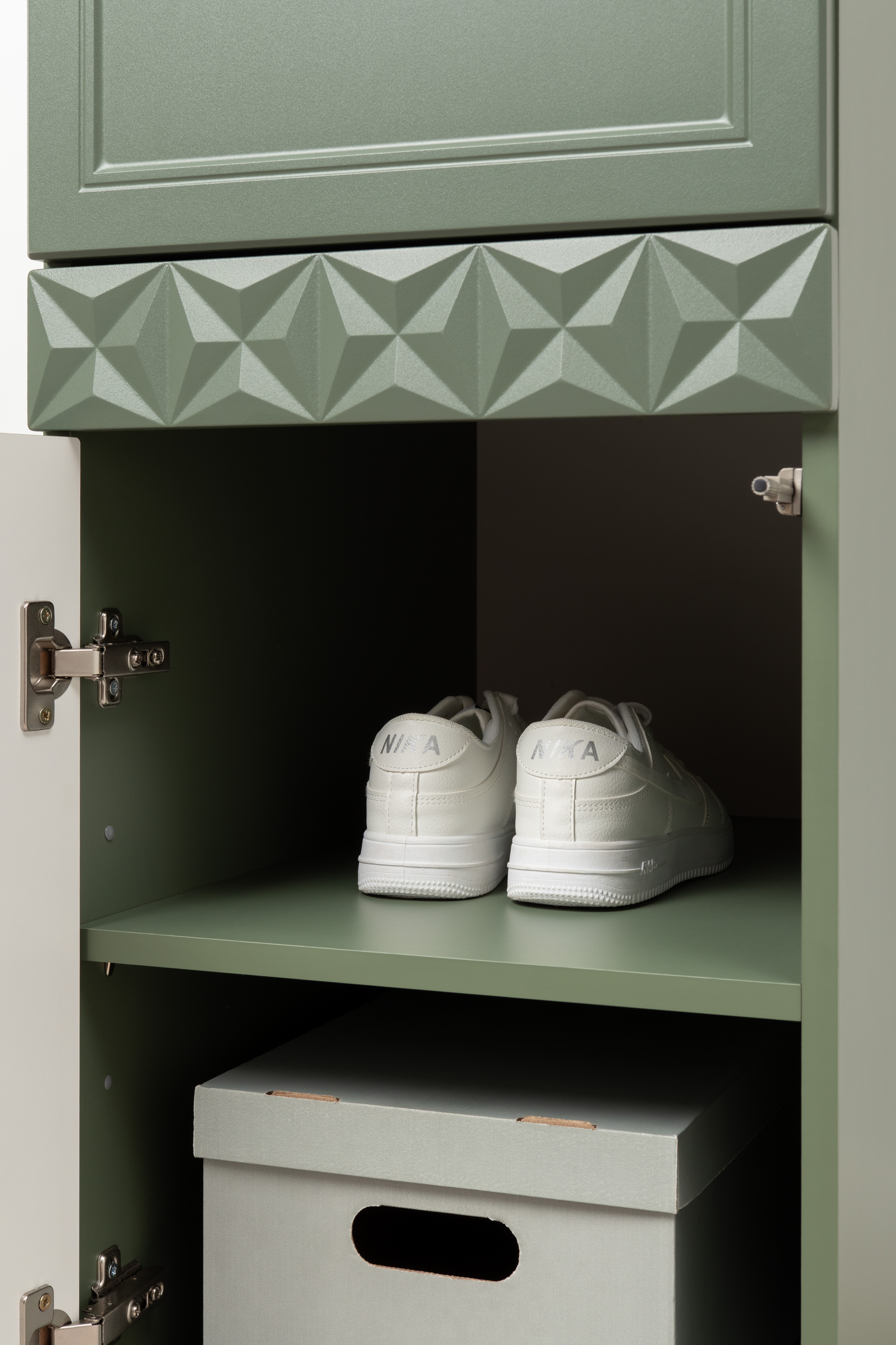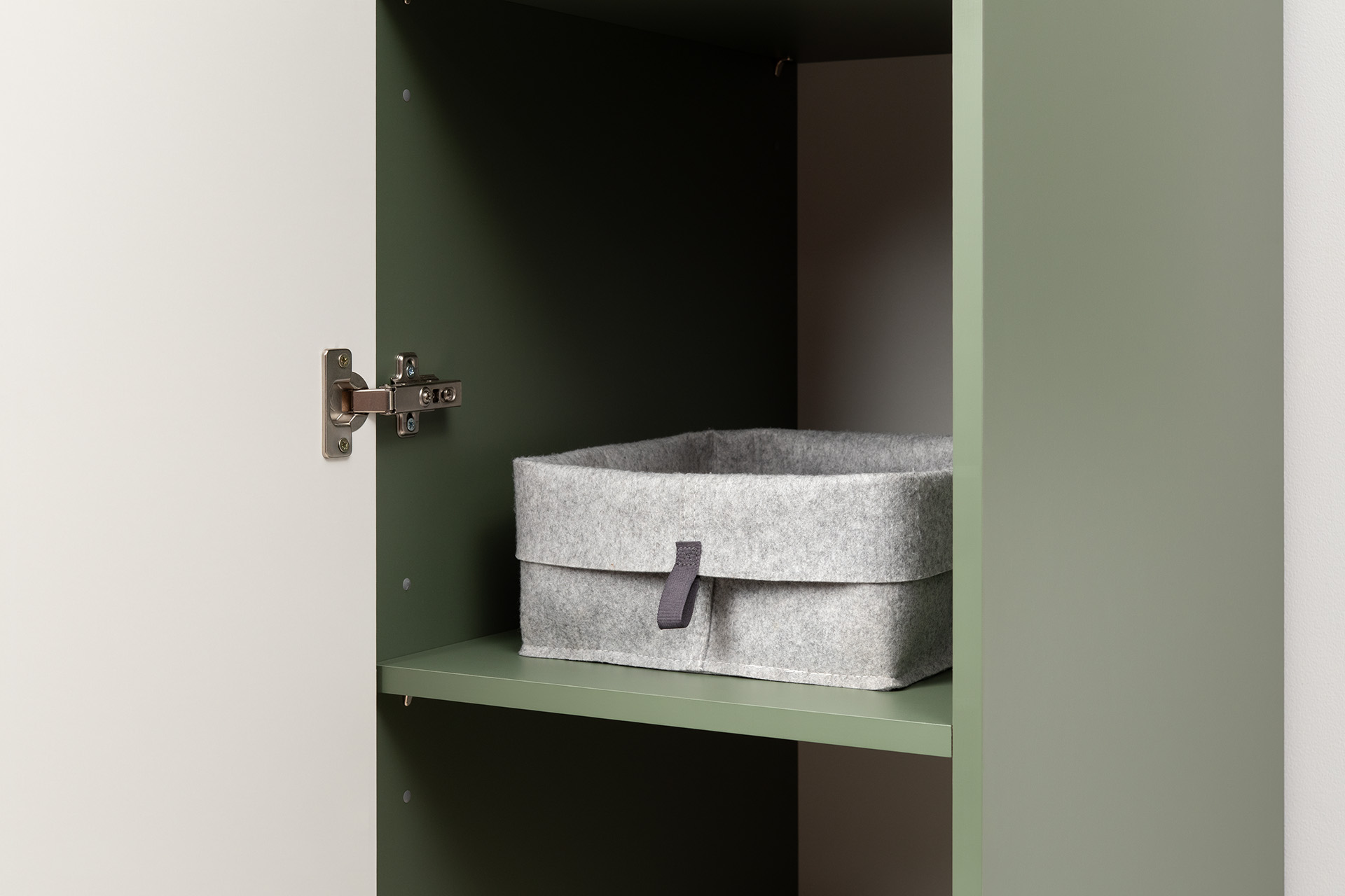 Шкаф-пенал Марион 16.340.01 дымчатый зеленый K521, олива шагрень AG 1050 ПВХ (собирается на любую сторону)