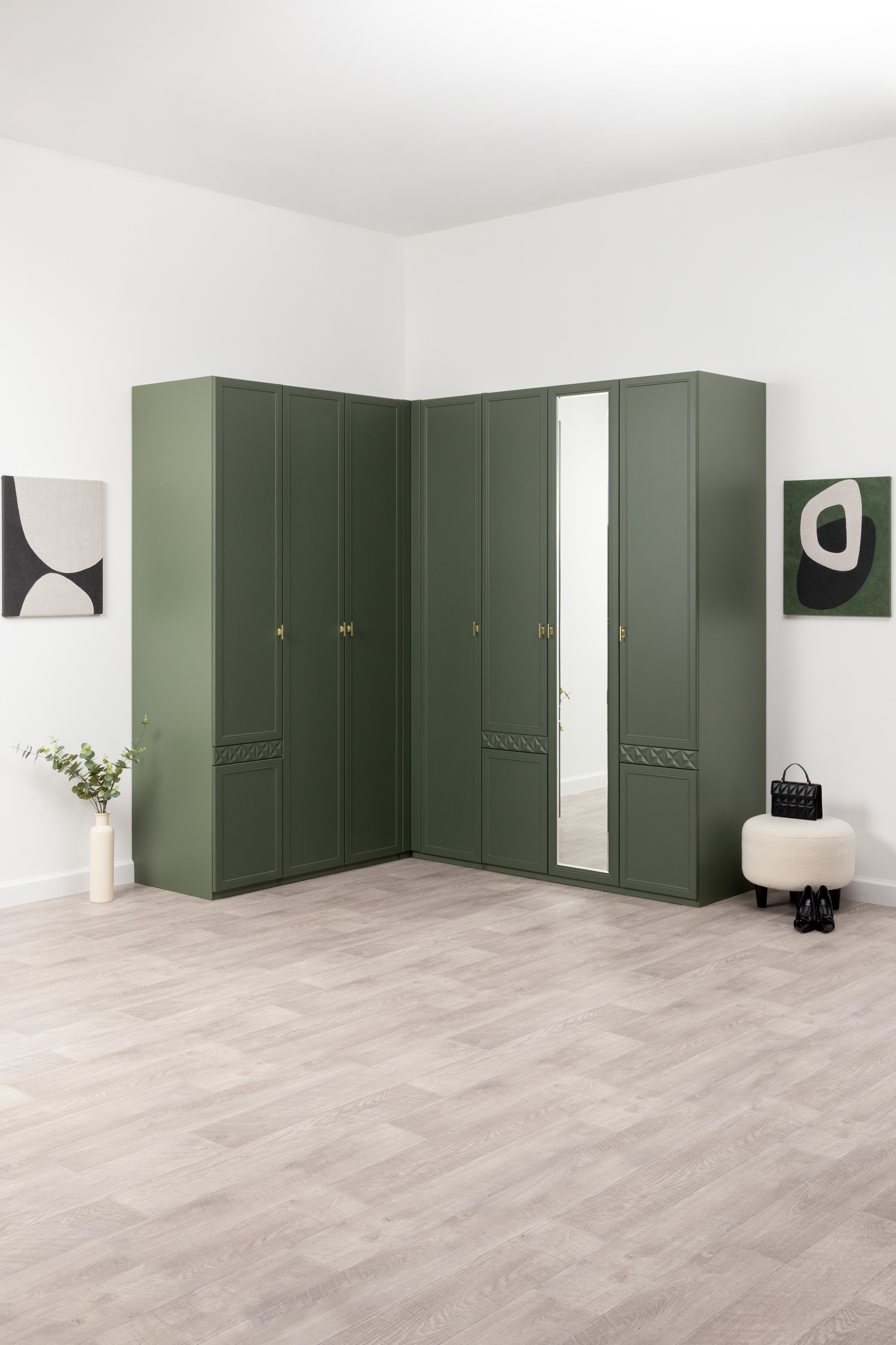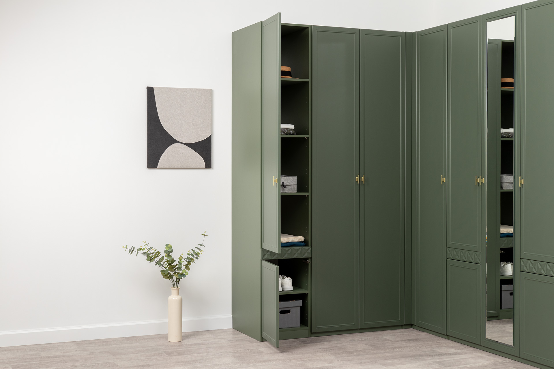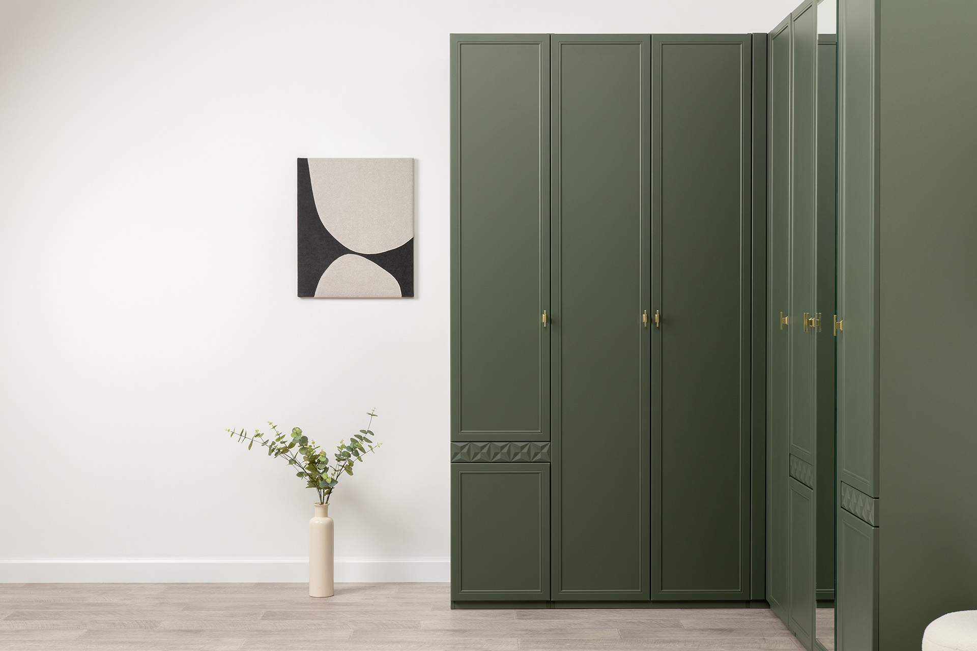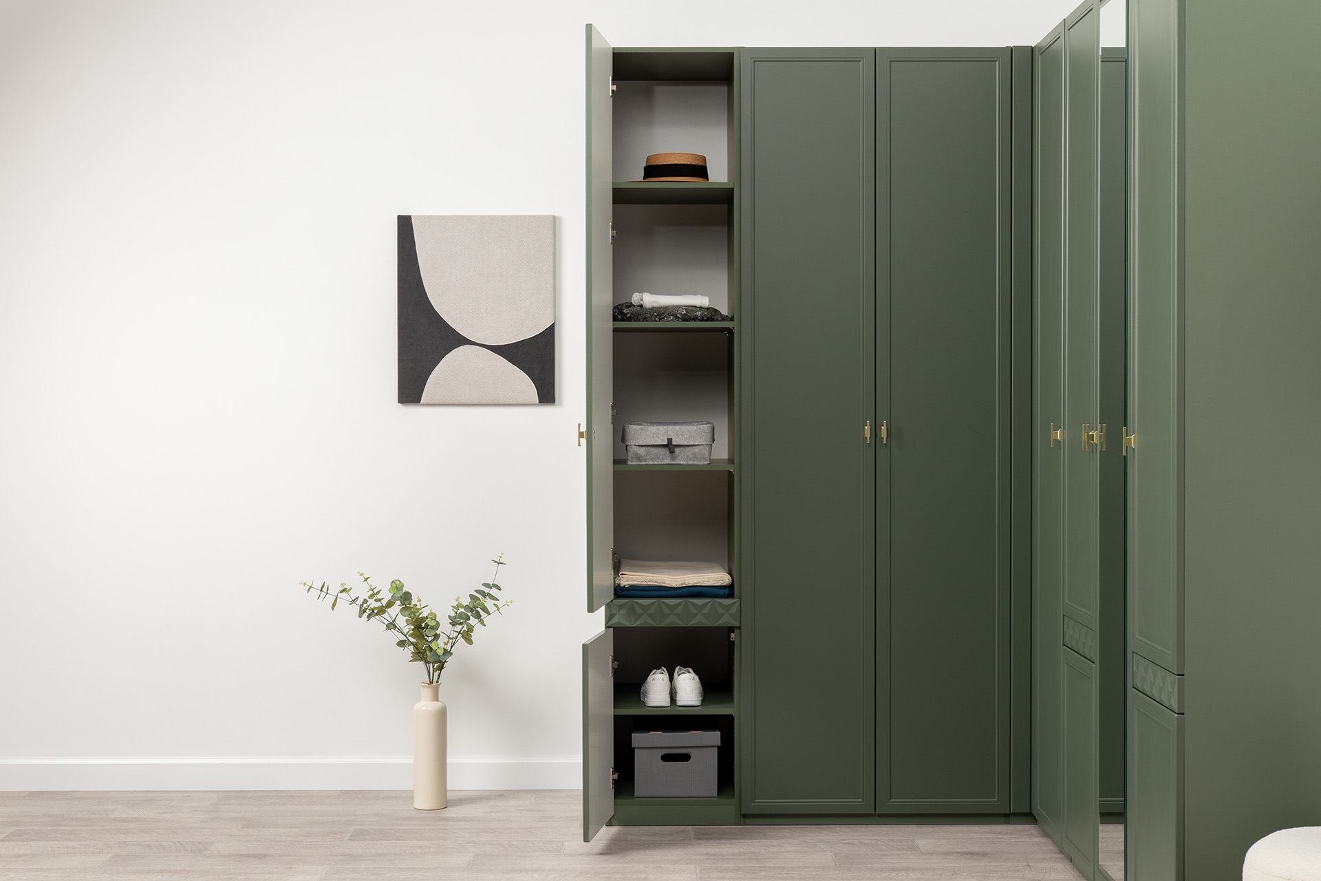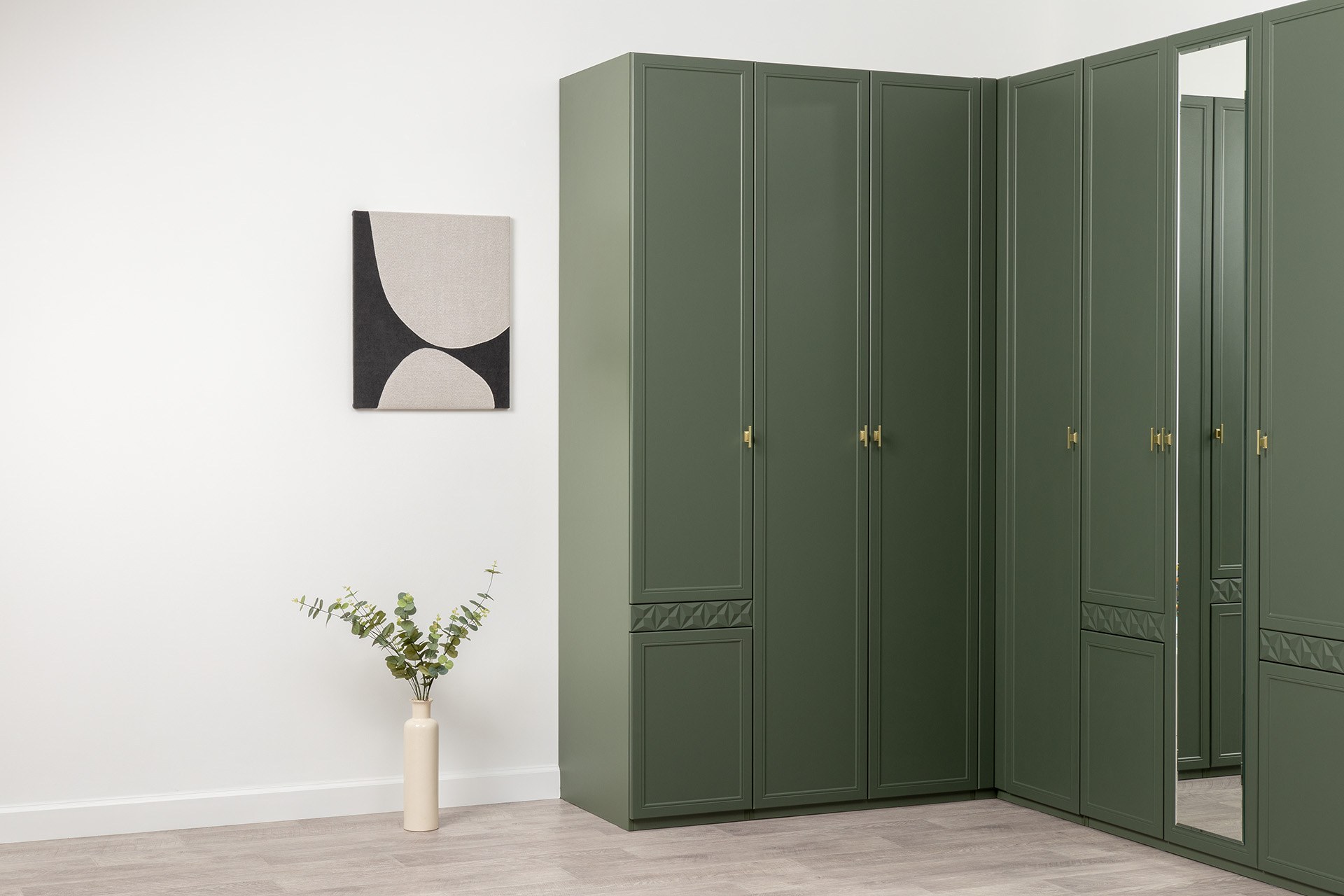 Шкаф-пенал Марион 16.340.01 дымчатый зеленый K521, олива шагрень AG 1050 ПВХ (собирается на любую сторону)