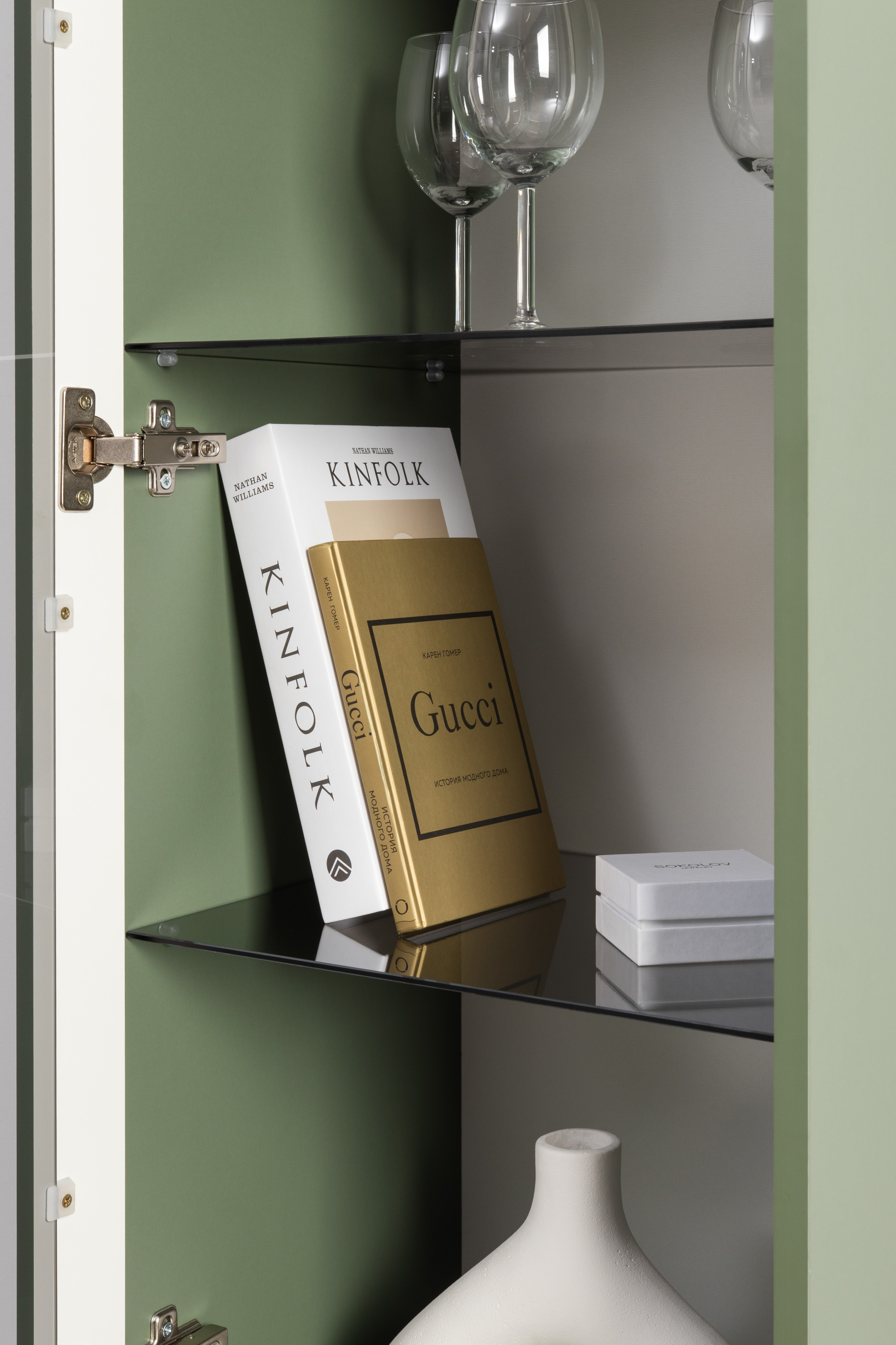 Шкаф-витрина Марион 16.397.01 дымчатый зеленый K521, олива шагрень AG 1050 ПВХ (собирается на любую сторону)
