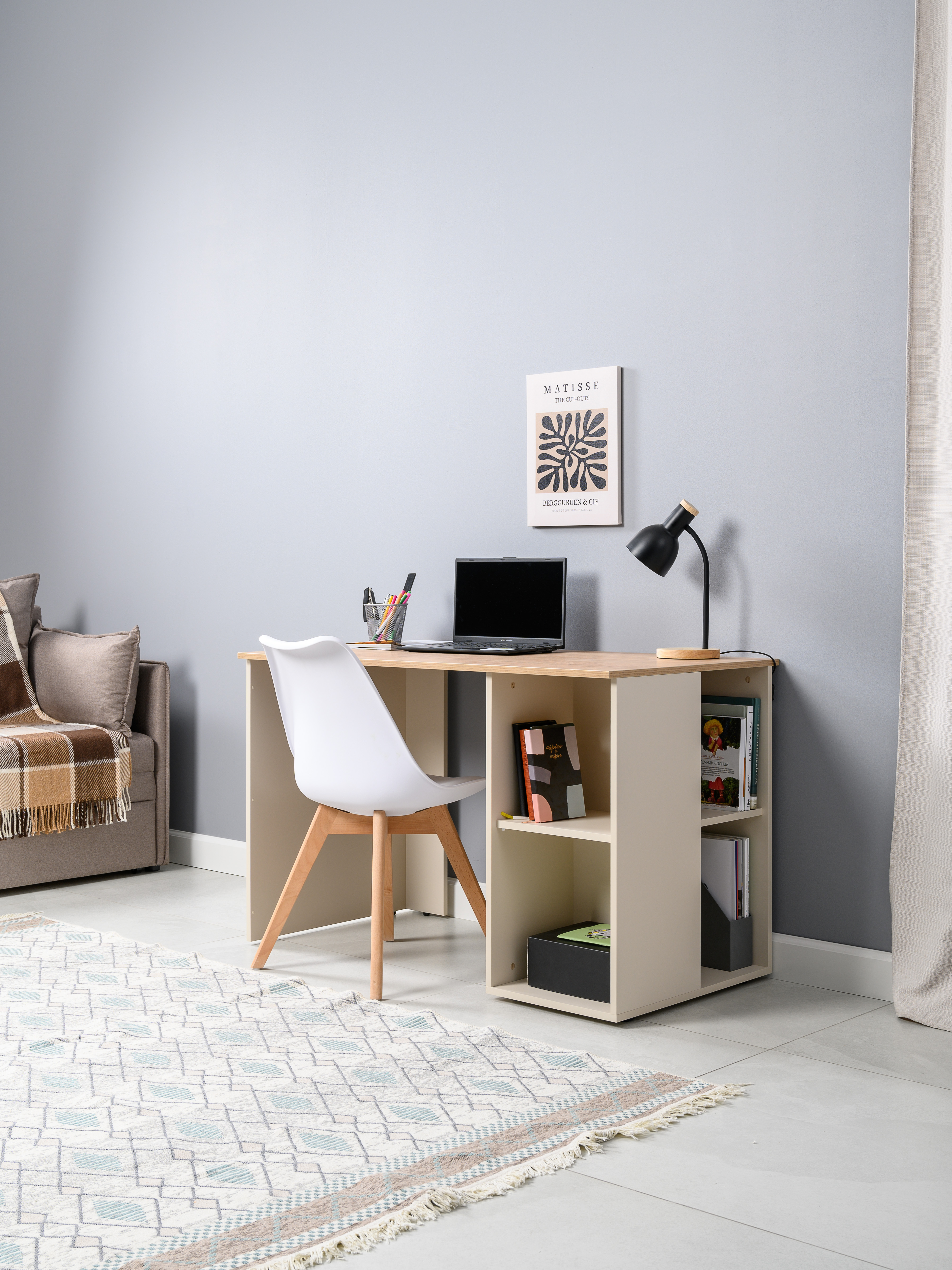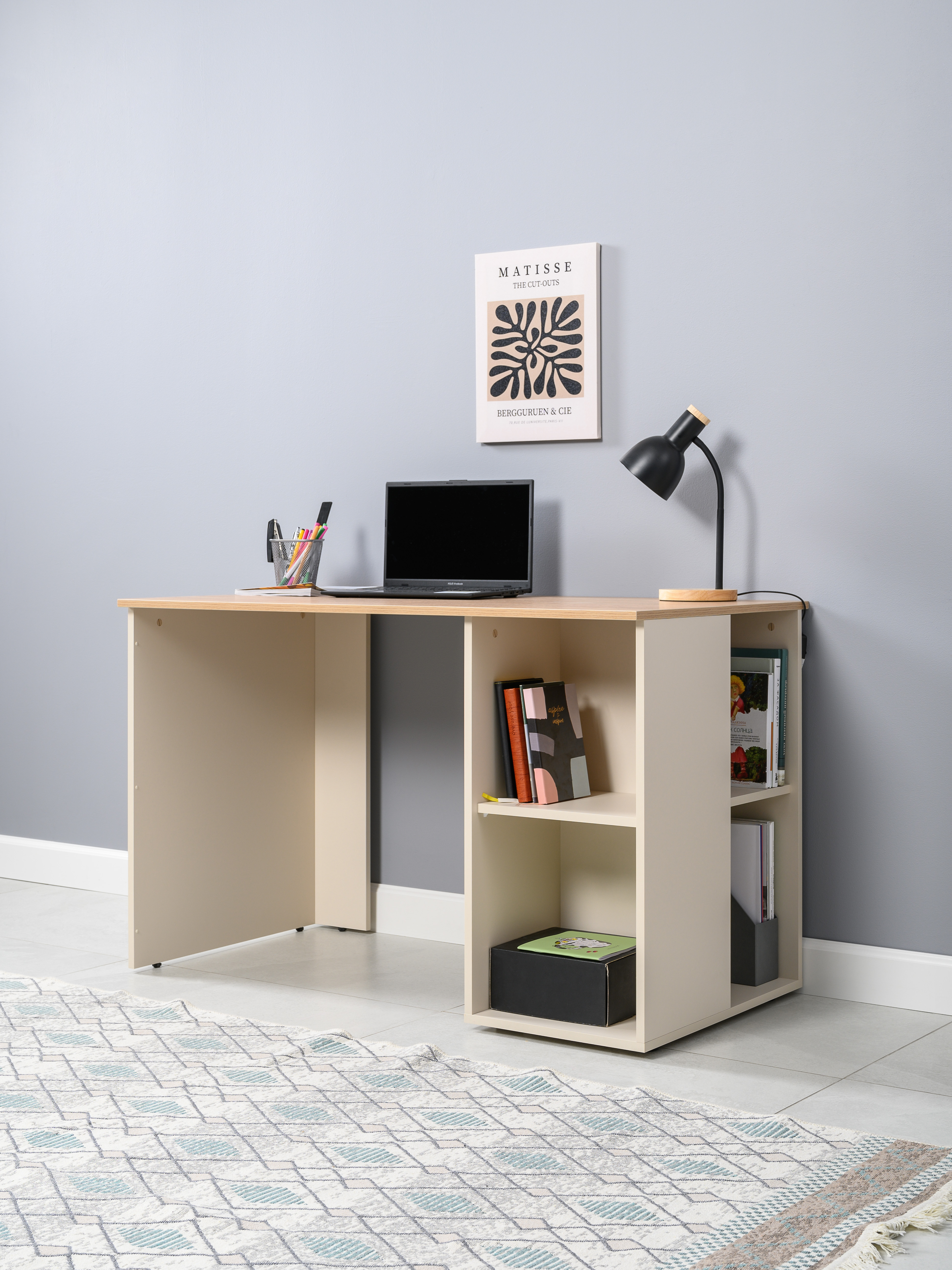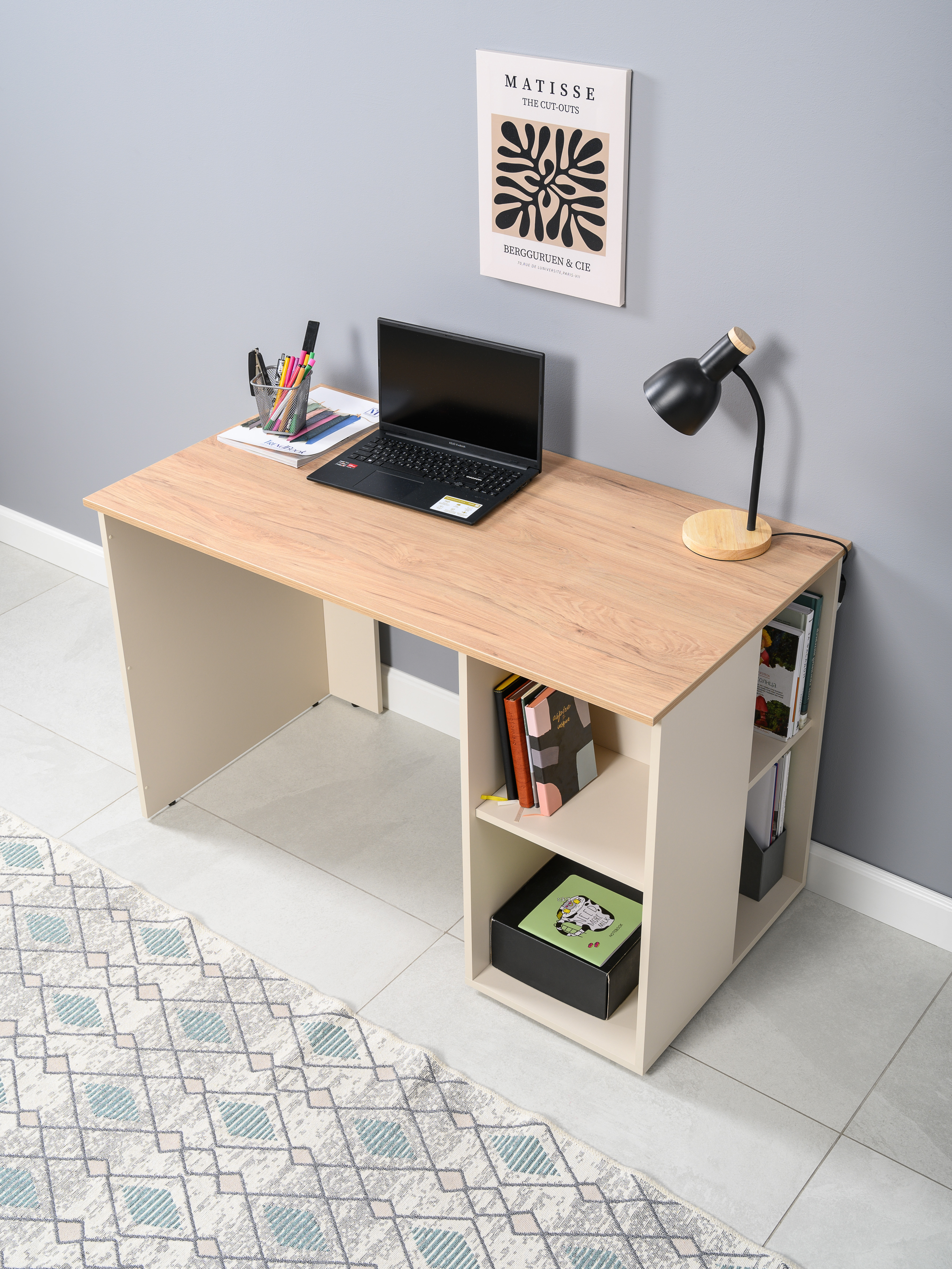 Стол письменный Лайт 12.163 сатин 7045 SU, гикори рокфорд натуральный KO86 PW, сборка на любую сторону, два варианта сборки тумбы