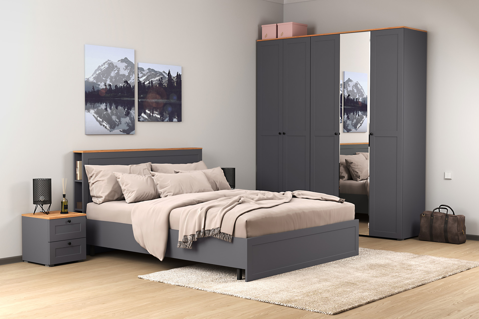 В изголовье кровати предусмотрены вместительные ниши. Шкафная группа полноценной глубины позволяет эффективно организовать систему хранения.