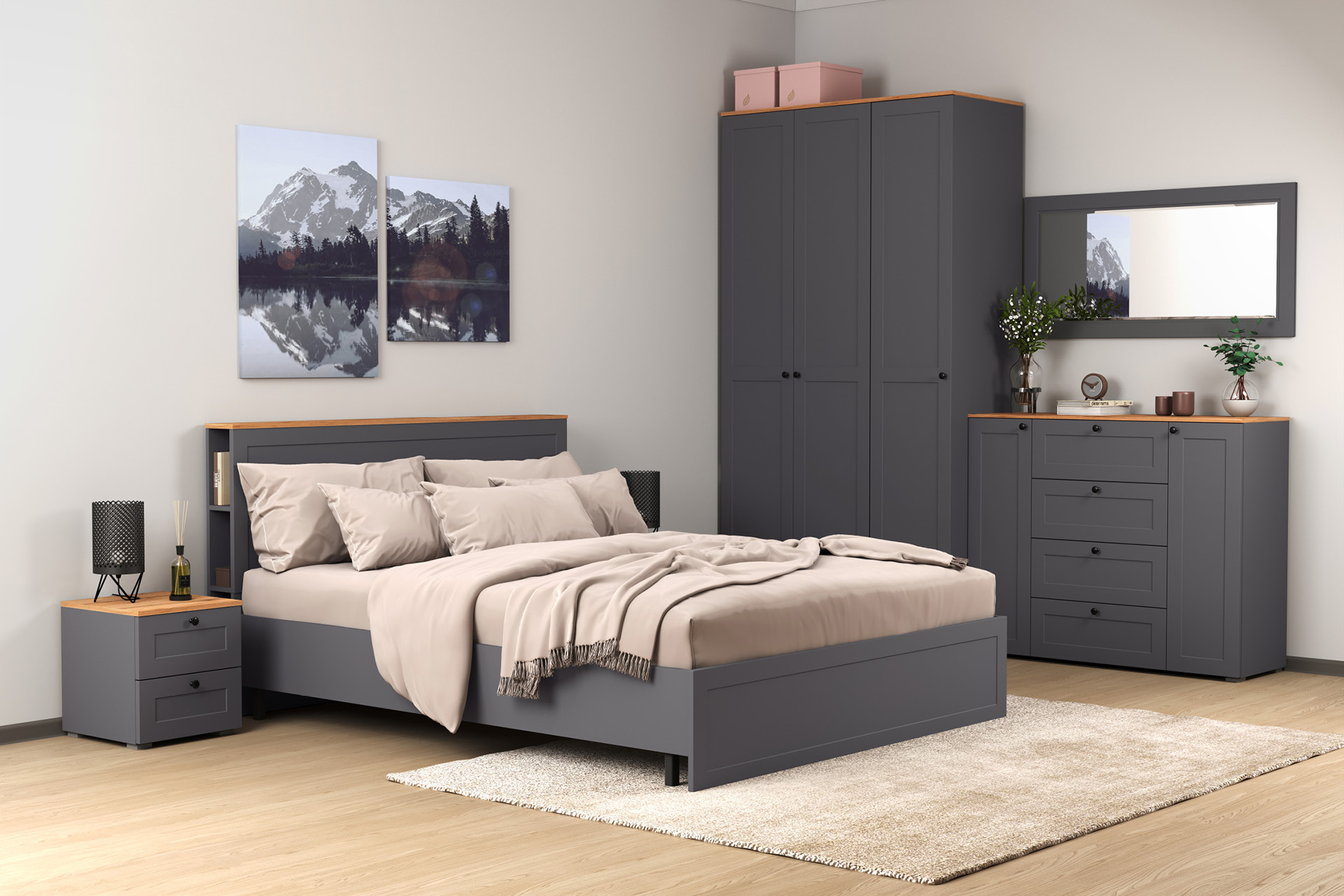 Доступна в двух цветовых решениях – белый/графит в сочетании с теплым древесным декором.