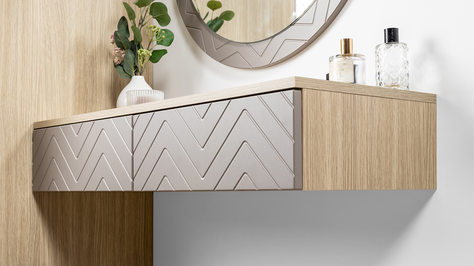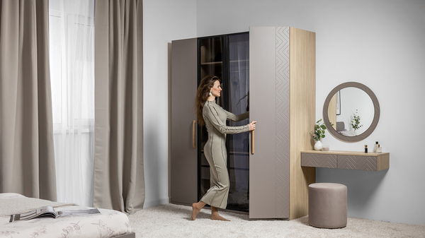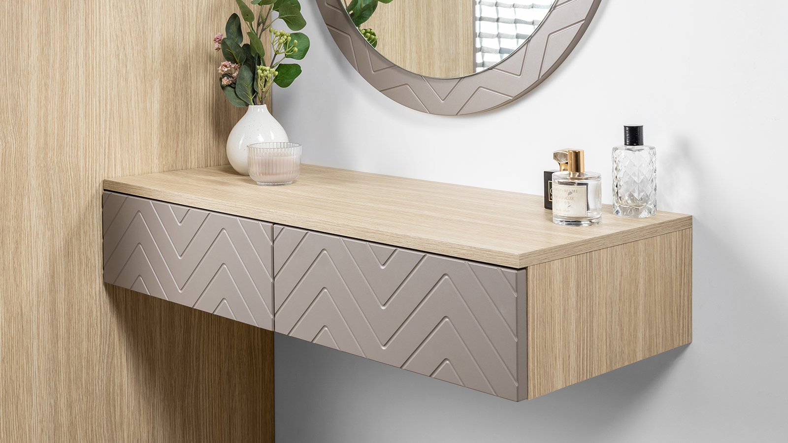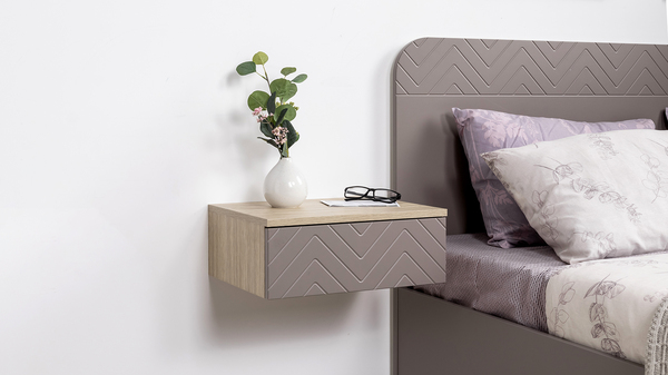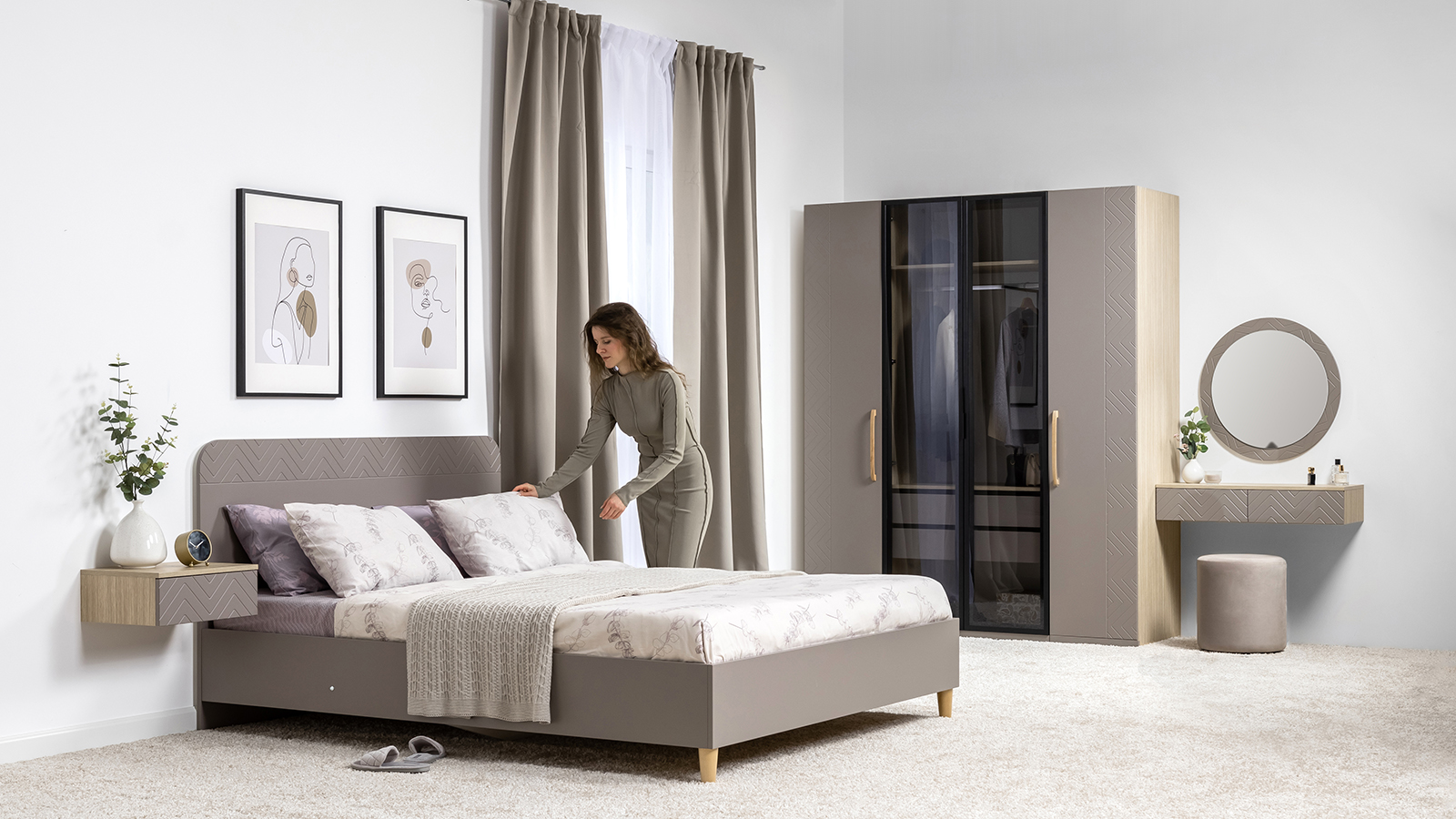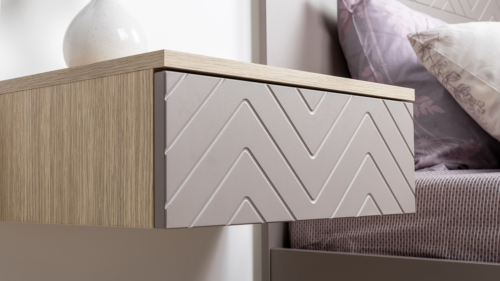 Подвесные консоли и велюровый пуф в тон фасадов дополняют сдержанный и благородный облик спальни Амьен.
