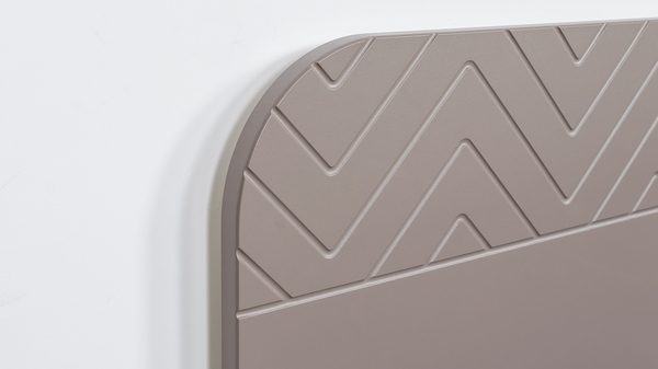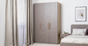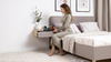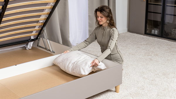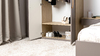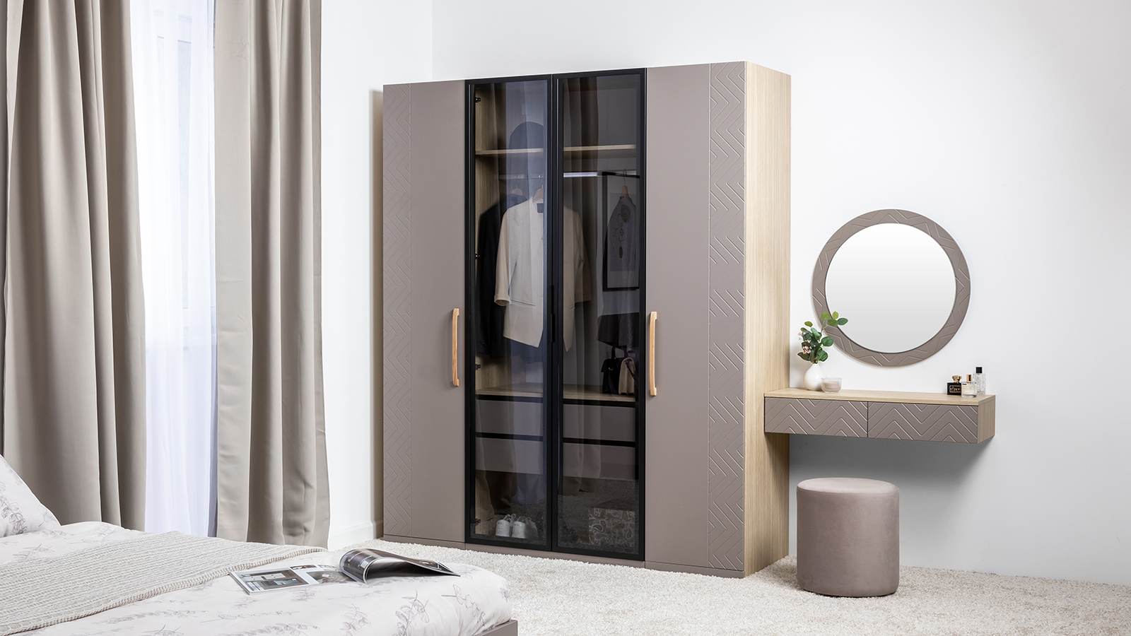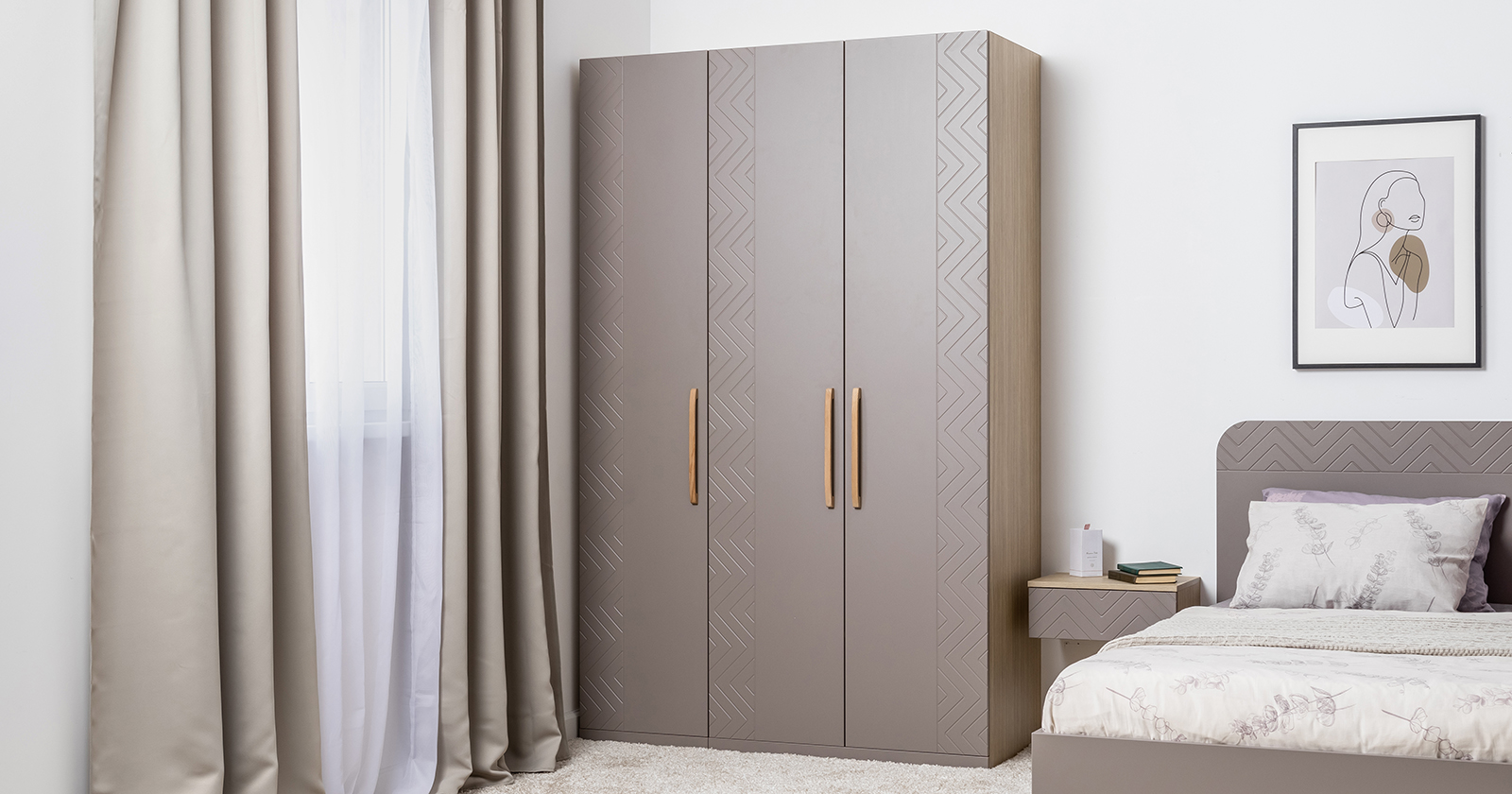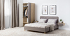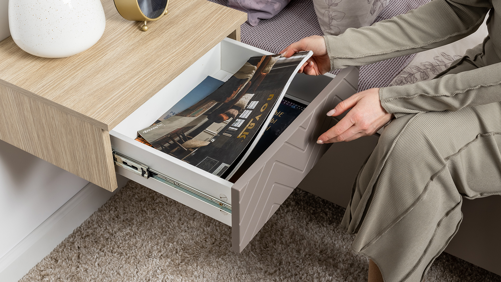 Подвесные консоли и велюровый пуф в тон фасадов дополняют сдержанный и благородный облик спальни Амьен.